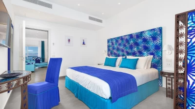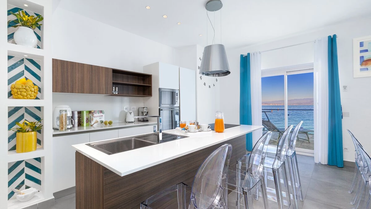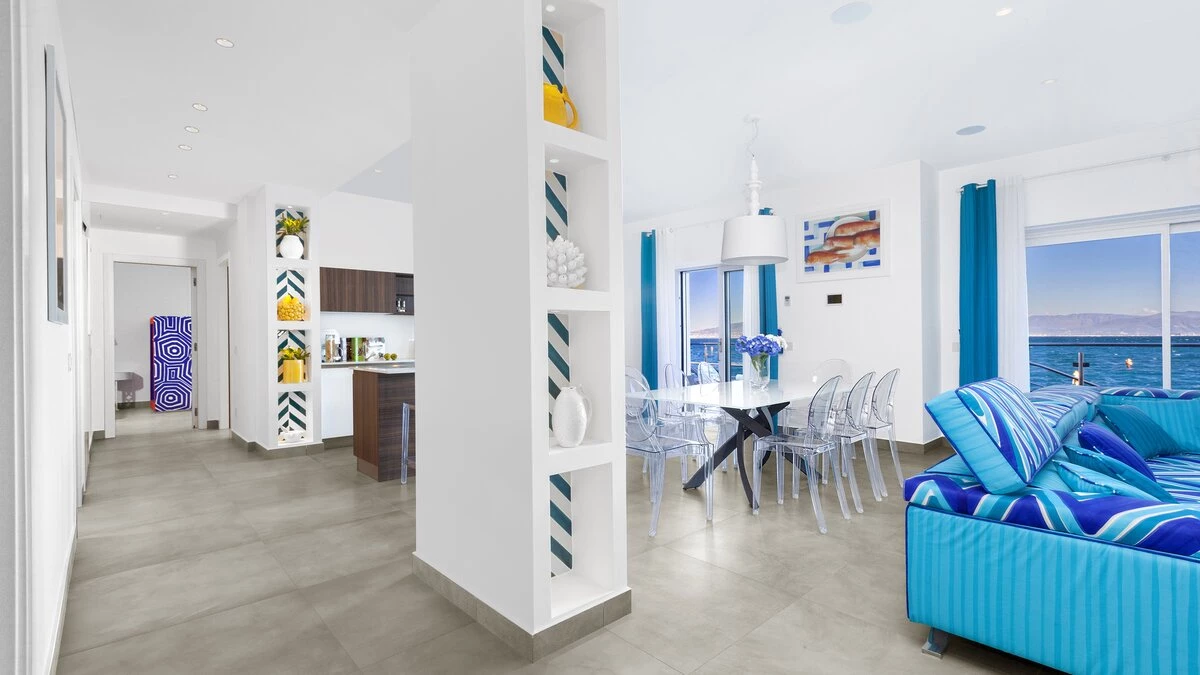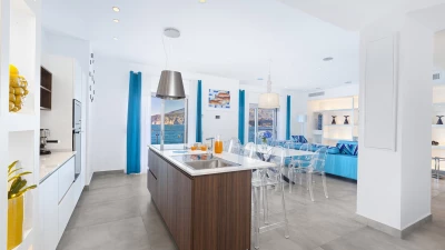 All on one level, the villa sleeps up to eight guests in four en-suite bedrooms, each with flexible king or twin beds, air conditioning, and direct access to the terrace or garden. The open-plan living and dining space features stylish furnishings, a smart TV and a well-equipped open plan kitchen, opening onto a sea-view terrace – just steps away from the crystal-clear water.