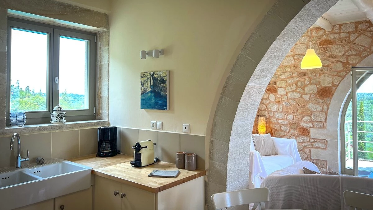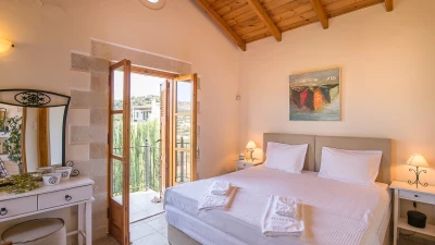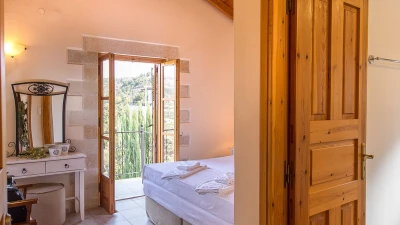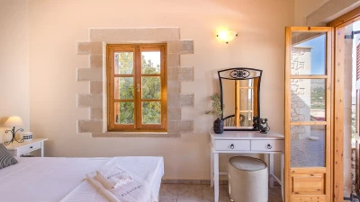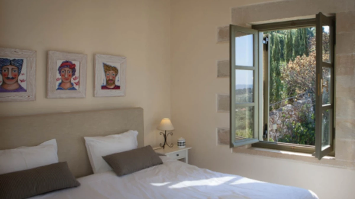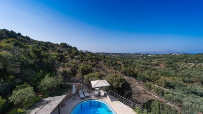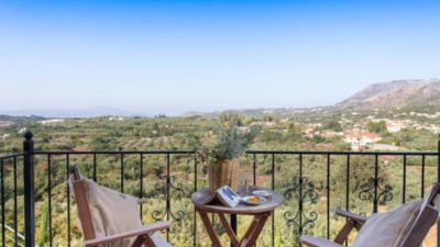 Welcoming, comfortable and utterly conducive to rest and relaxation, this charming villa is one of two very popular properties which share a rural estate. Each completely independent, with a high degree of privacy, Meli and its sister-villa Levanda enjoy an extraordinarily peaceful setting, with the Green Mountains as a backdrop and views, over olive groves and the roof tops of Gavalochori, to tantalising glimpses of the Cretan Sea. The village is a ten minute walk away, with a couple of tavernas and grocery shops, while sandy beaches on the bay are about a ten minute drive.