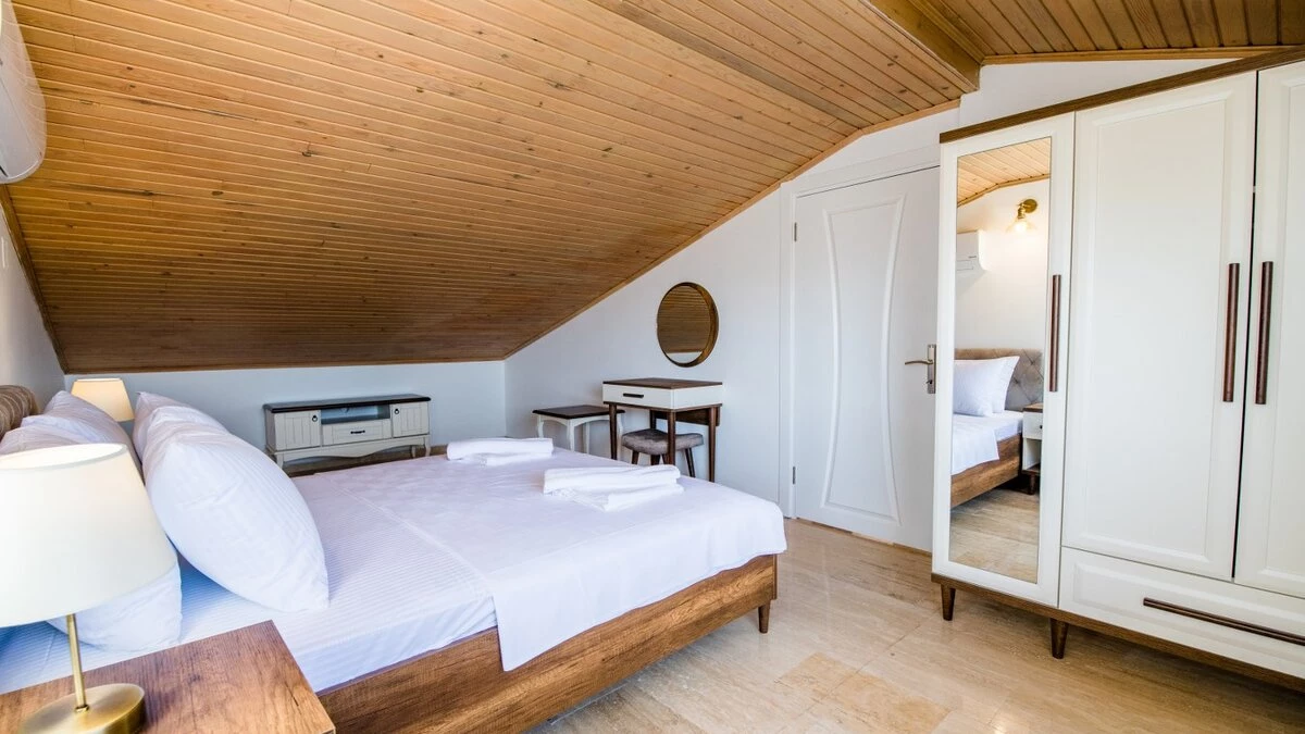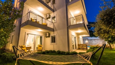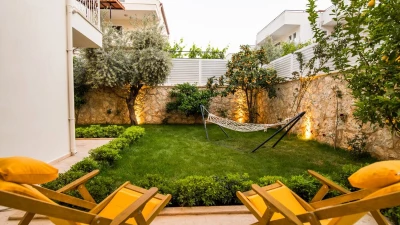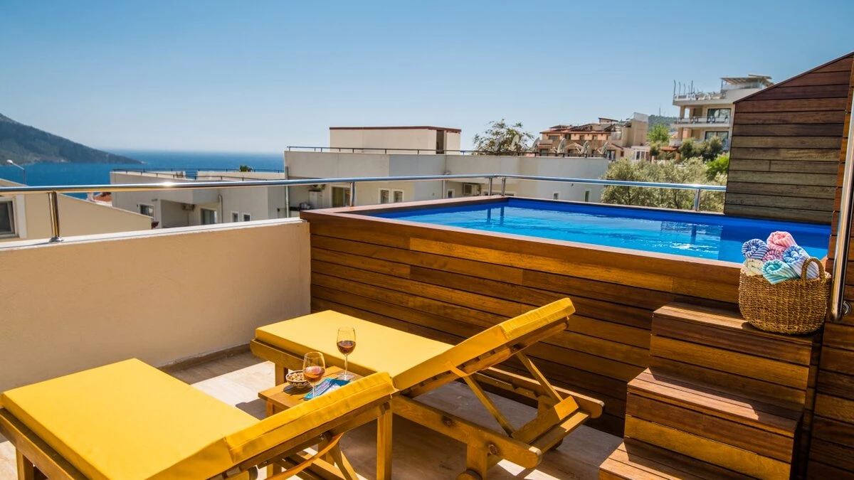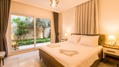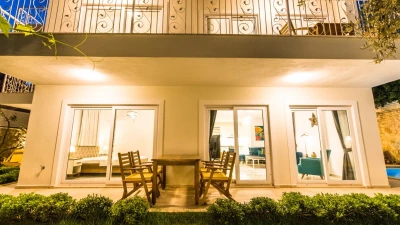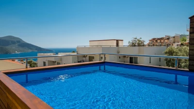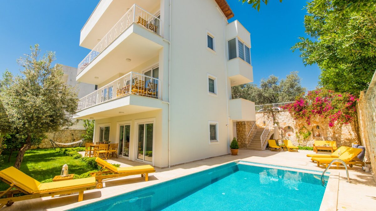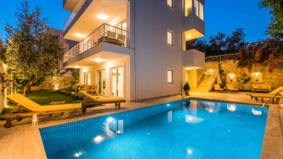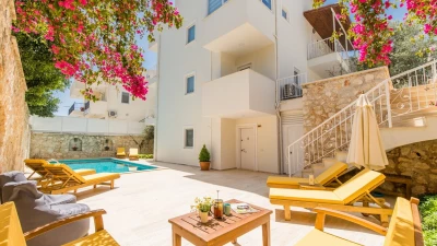 Villa Merkez is a large, spacious property ideal for large groups seeking an escape in Turkey. The villa is split across three apartments, offering the perfect combination of proximity and privacy. Each apartment is modern, bright and airy. The ground floor apartment includes a spacious living, dining and kitchen area, as well as two double bedrooms opening to either the garden or a private terrace. The second apartment is located at street level, boasting an almost identical layout, except that the two double bedrooms provide access to balconies instead. The top floor apartment features a similarly welcoming kitchen, living room and dining area. There are three en suite double bedrooms here, two opening to a balcony and the third to the sun-kissed roof terrace. This is the best spot to soak up Kalkan's sunshine and views, complete with sun loungers and a plunge pool. There is also a private pool in the garden.