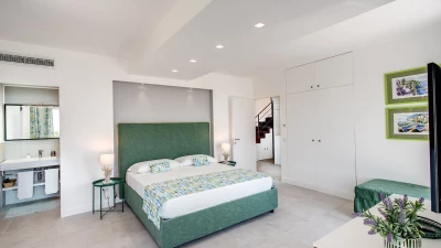 Inside, the villa boasts a bright, open-concept living/kitchen area n, perfect for socialising and enjoying home-cooked meals. An adjacent bedroom, accessed from the terrace, features a private double bedroom with an en-suite shower room for added privacy. The first floor houses two well-appointed double bedrooms, each with en-suite facilities and terrace access to enjoy panoramic sea views. On the second floor, an additional double bedroom with an en-suite shower room and dual terraces provides a serene escape for relaxation.