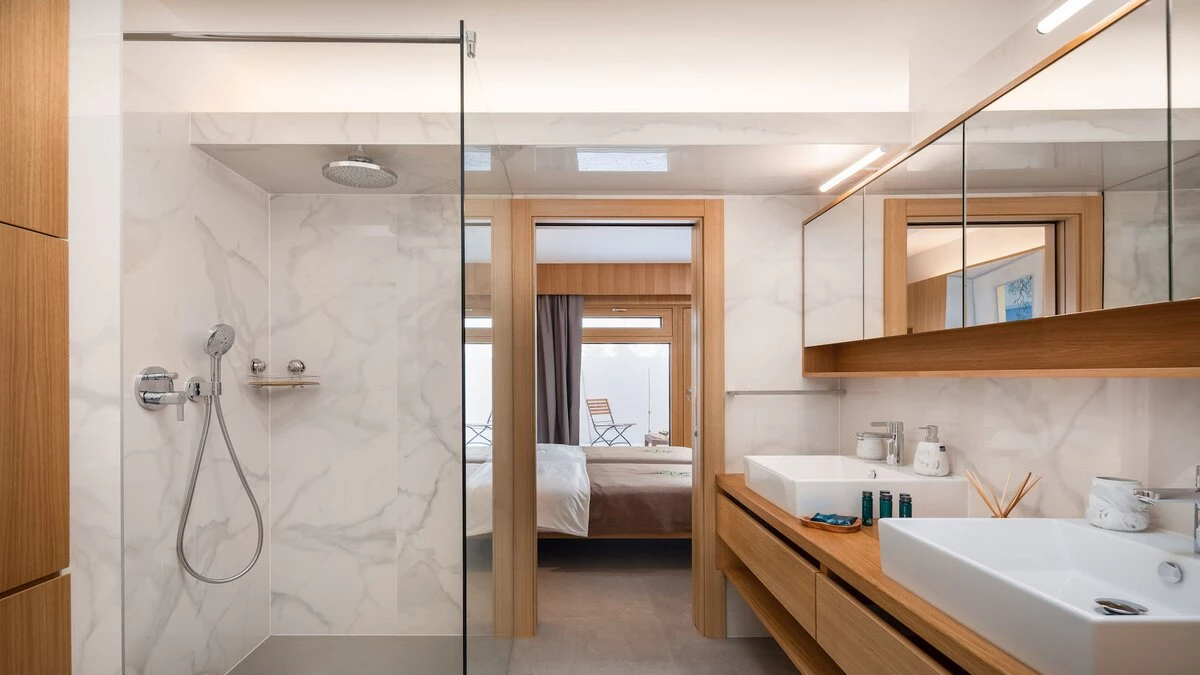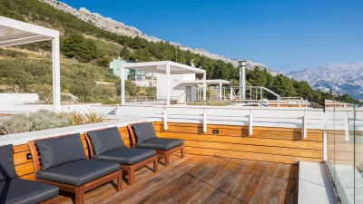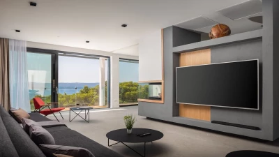 Luxurious Villa Moda is characterised by its impeccable seascapes, elegant style, contemporary design and unparalleled comfort. All this is set against the mesmerizing backdrop of the Adriatic in a secluded yet convenient location. On the first floor, guests will discover a wonderful wellness space, complete with a hydro-massage Jacuzzi, gym, hammam and Finnish sauna. Hop on the treadmill, take a ride on the exercise bike or check into the spa and treat yourself to a day of relaxation. Upstairs there is a spacious and modern living room with wonderful floor-to-ceiling windows to best showcase the views. The open-plan, fully-equipped kitchen is perfect for entertaining. With four comfortable and airy en suite bedrooms, eight guests are all comfortably accommodated. The villa also features a garage on the ground floor, which includes a lift up to the second storey. The rooftop terrace is another highlight of this property, the perfect spot to enjoy a sunset barbecue or simply soak in Croatia's incredible natural beauty.