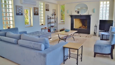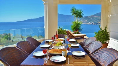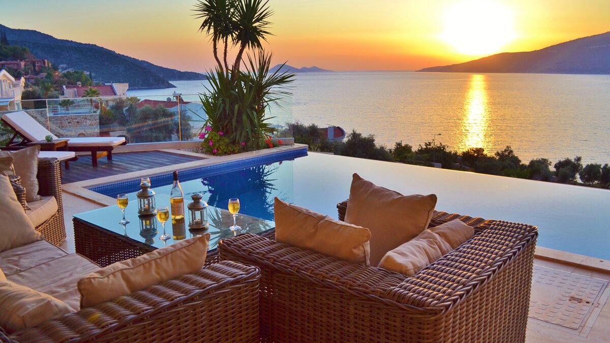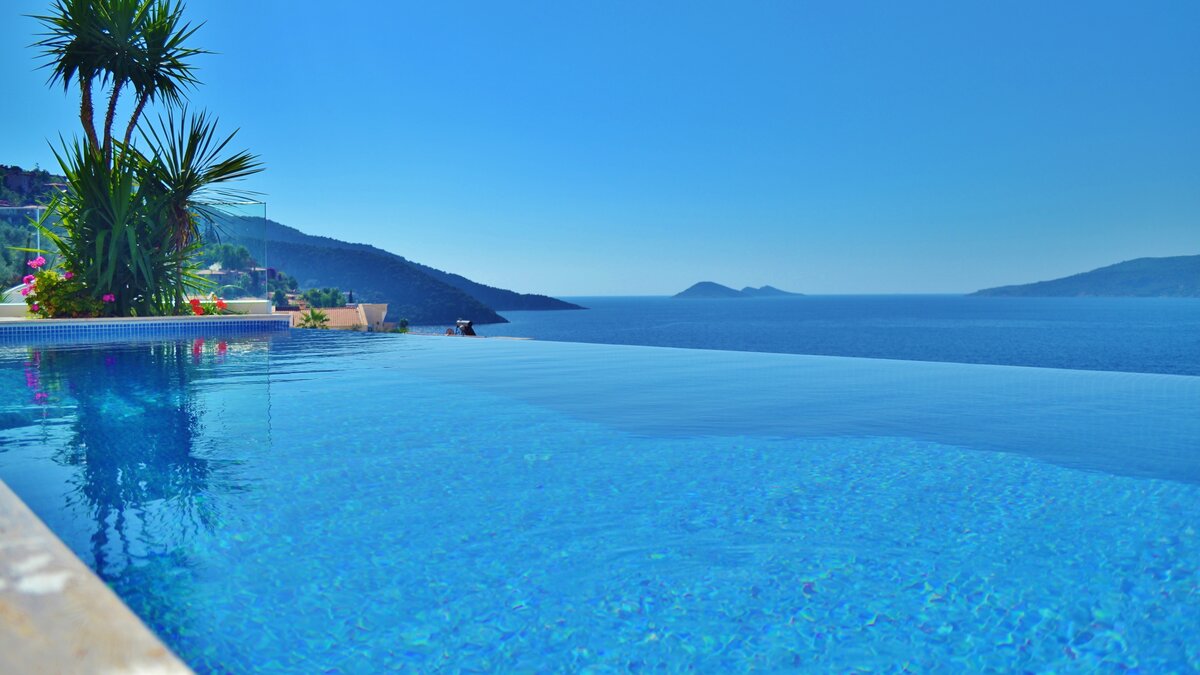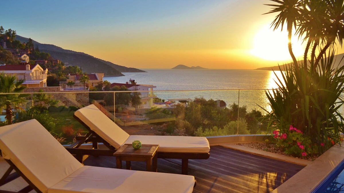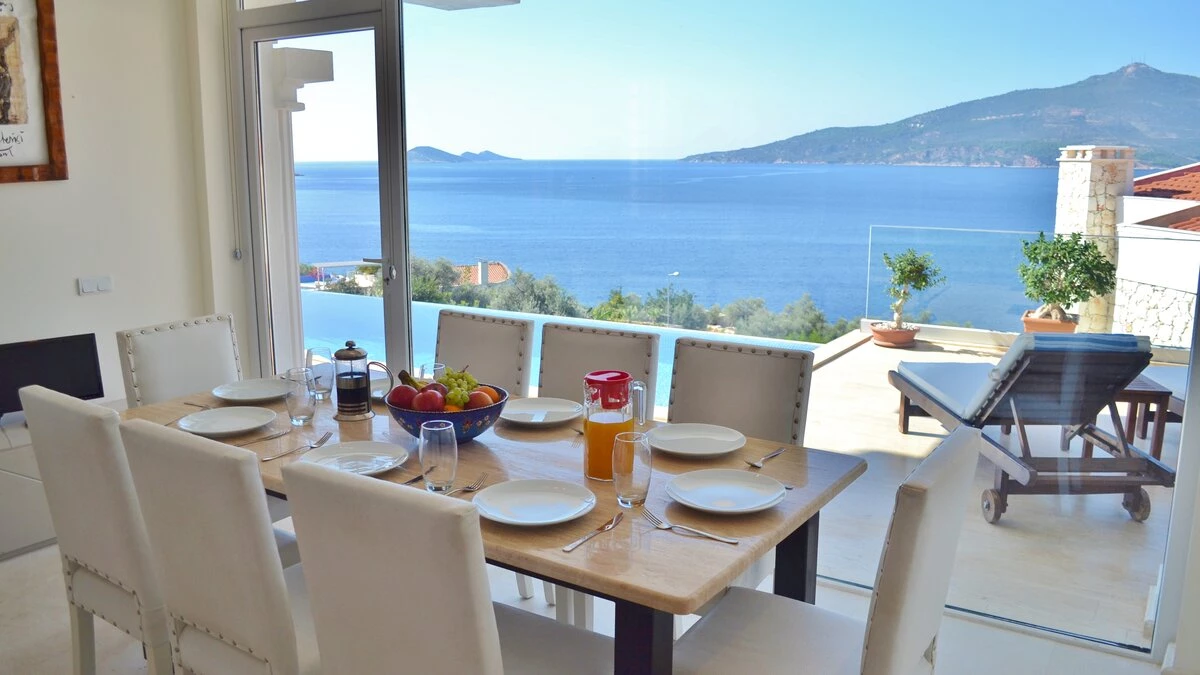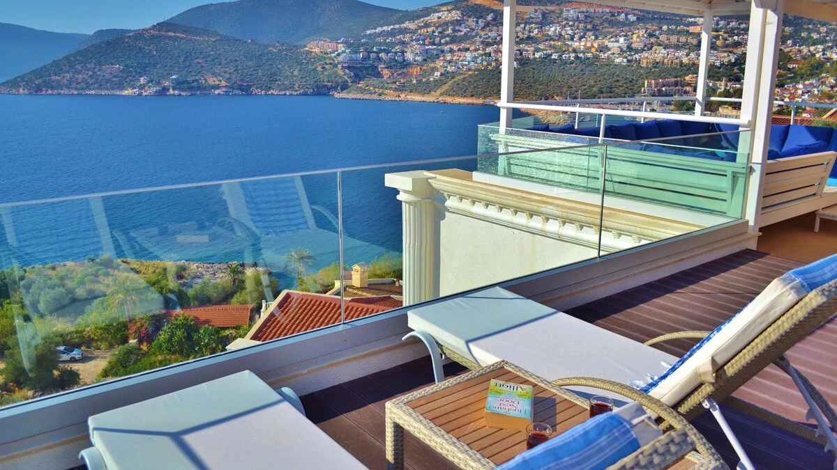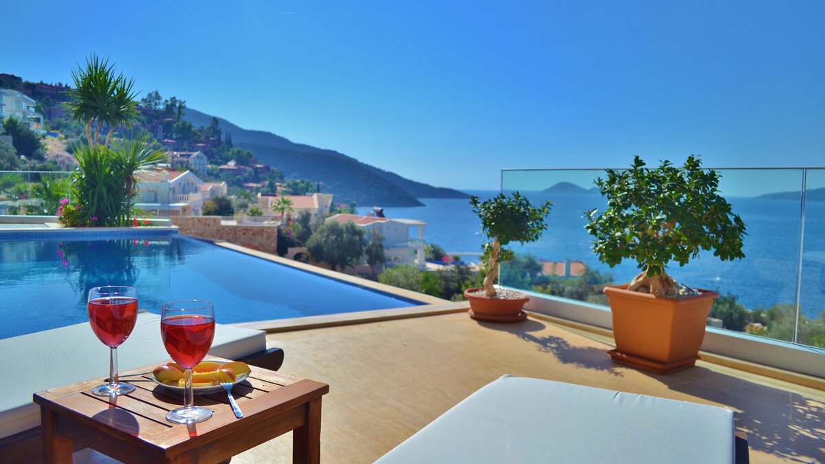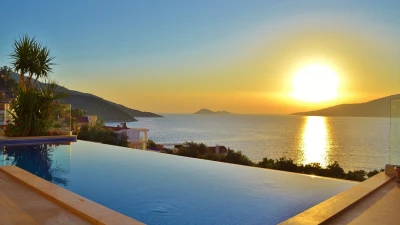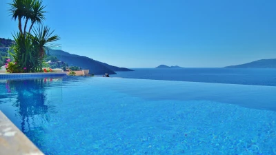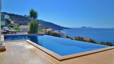 Completely in keeping with its setting in the prestigious Komurluk area of Kalkan, this lovely house looks out to breathtaking views of the sea, the sunsets, the scenic shoreline of the Turquoise Coast, and the lights of Kalkan harbour, just a ten min walk away. A three storey villa, Myra’s ground floor rooms open out to the poolside and garden, and include a modern monochrome kitchen and a light and spacious living room with a dining area, soft grey sofas, satellite TV, and an open fireplace. There are two stylishly uncluttered bedrooms on each of the two upper levels, all with en suite bath or shower room, air conditioning and a glass fronted balcony onto those gorgeous views.  Crowning the villa, the roof-top terrace has a sizeable Jacuzzi and an Ottoman seating area, with atmospheric lighting for drinks under the stars. And the garden is replete with a furnished deck for relaxation, a barbecue and al fresco dining area, and an inviting infinity pool which seems to spill into the bay below. An easy stroll from the historic old town and myriad shops and restaurants, the villa is within 200m of both the Palm Beach Club and Kalkan’s town beach.