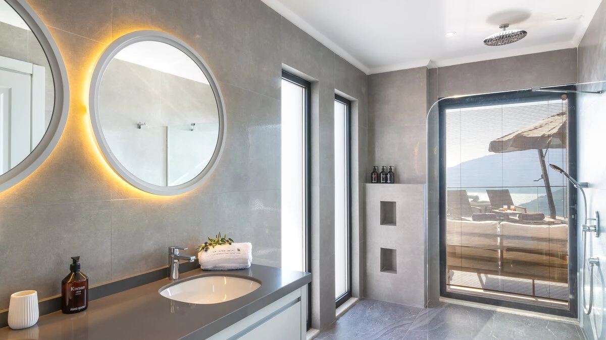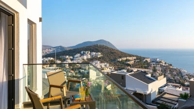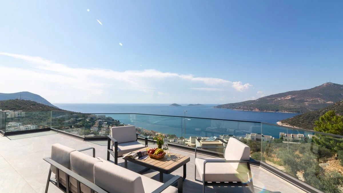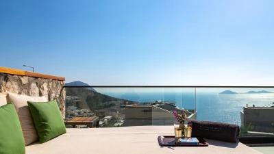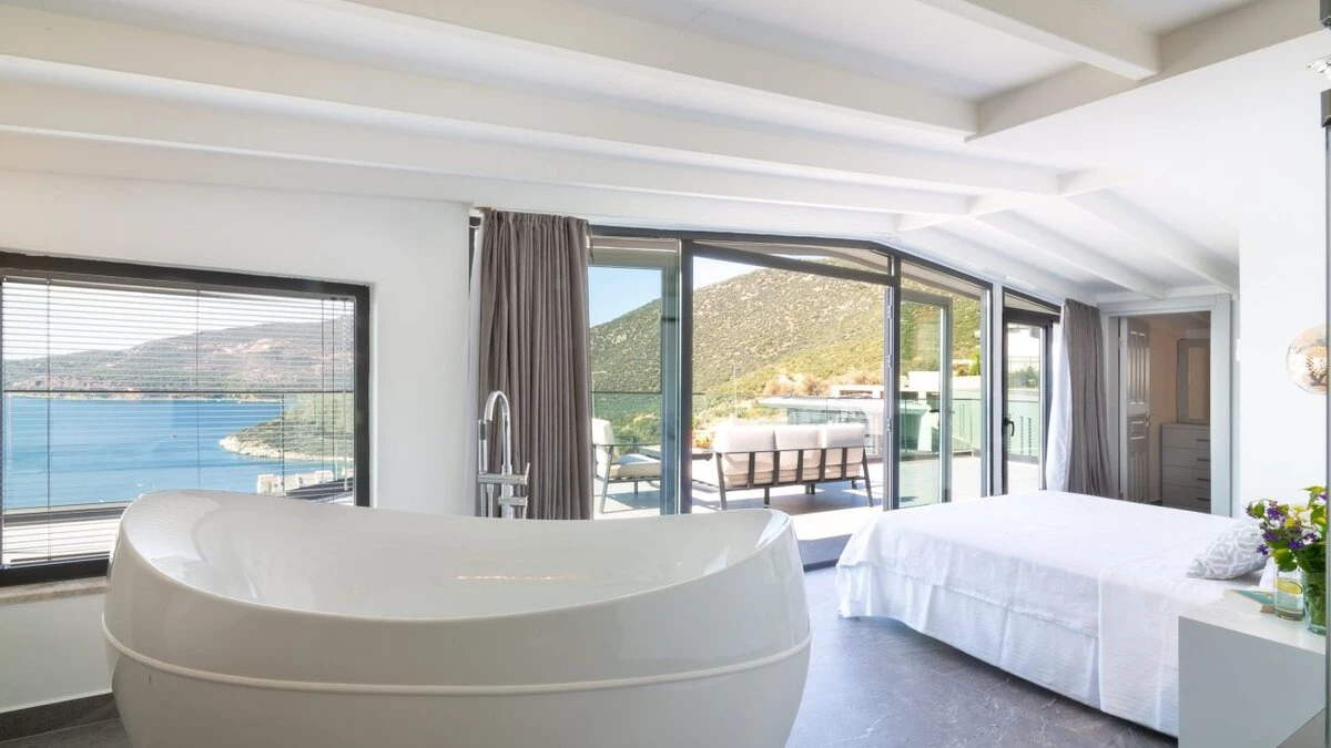 On the first floor, there are three double bedrooms all with en suite shower rooms. A shared balcony is available for all the guests on this floor, where they can admire the Kalkan sunsets. Make your way up to the second floor where the master bedroom is situated . This suite boasts a freestanding bath and private roof terrace. The lower ground floor has an additional double bedroom with en suite shower room and private balcony.