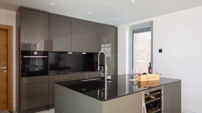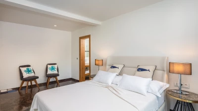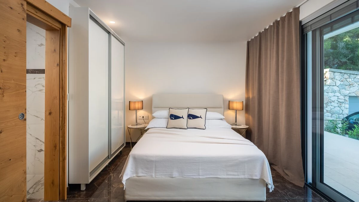 Inside accommodation is split between two floors. The ground floor comprises a compact and contemporary kitchen and indoor dining area, alongside a comfortable living area, all decorated in sleek shades of grey with cool marble floors underfoot.There are five fabulous bedrooms across two floors, all of which have either a shower or bathroom en suite; the best bedroom in the house is up on the first floor with floor to ceiling windows overlooking the sea.