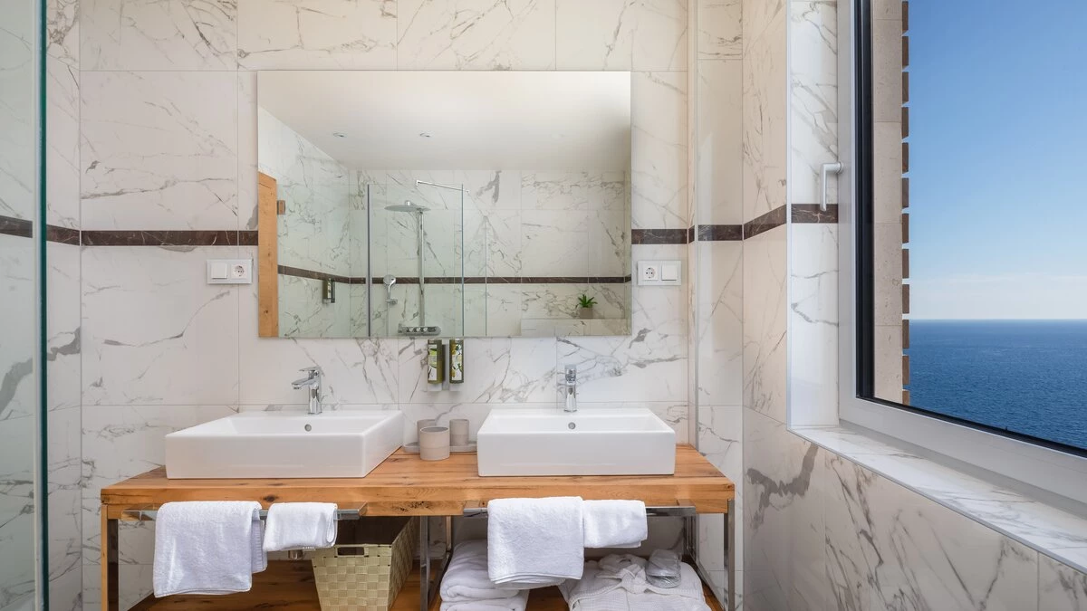 There is no denying, Villa Orchid is a standout villa. Unique in its design against a cascade of terracotta rooftops, Orchid is uber modern and eye-catching, with panoramic windows and a fabulous terrace, which forms the epicentre of this villa. An al fresco dining area sits immediately beside the house, which is shaded for guests comfort. Timber decking spans the width of the terrace beneath a comfortable seating area and a row of loungers poised to enjoy the sunshine. The pièce de résistance is a magnificent heated infinity pool, which blurs the lines between the water’s edge and the sapphire blue sea beyond and provides a perfect spot for admiring those powder pink sunset skies.