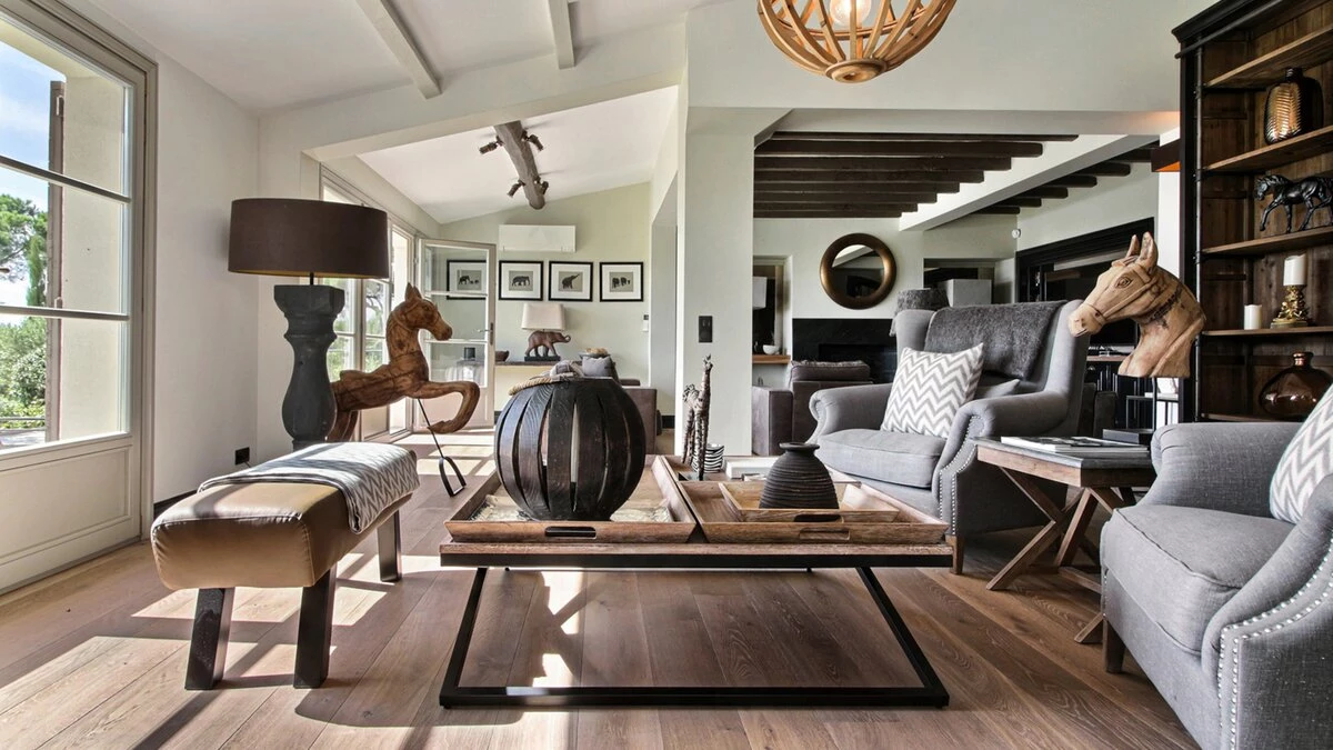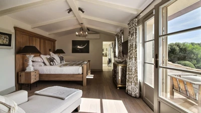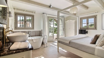 Designed for relaxed living and easy entertaining, the villa offers light-filled interiors that open seamlessly onto terraces and gardens. The open-plan living space brings together a generous lounge, a convivial tapas-style dining area and a well-equipped kitchen, all leading out to a large terrace with shaded dining and comfortable outdoor seating. Throughout the day, guests can choose from several outdoor lounges positioned around the house, perfect for following the sun or seeking shade.