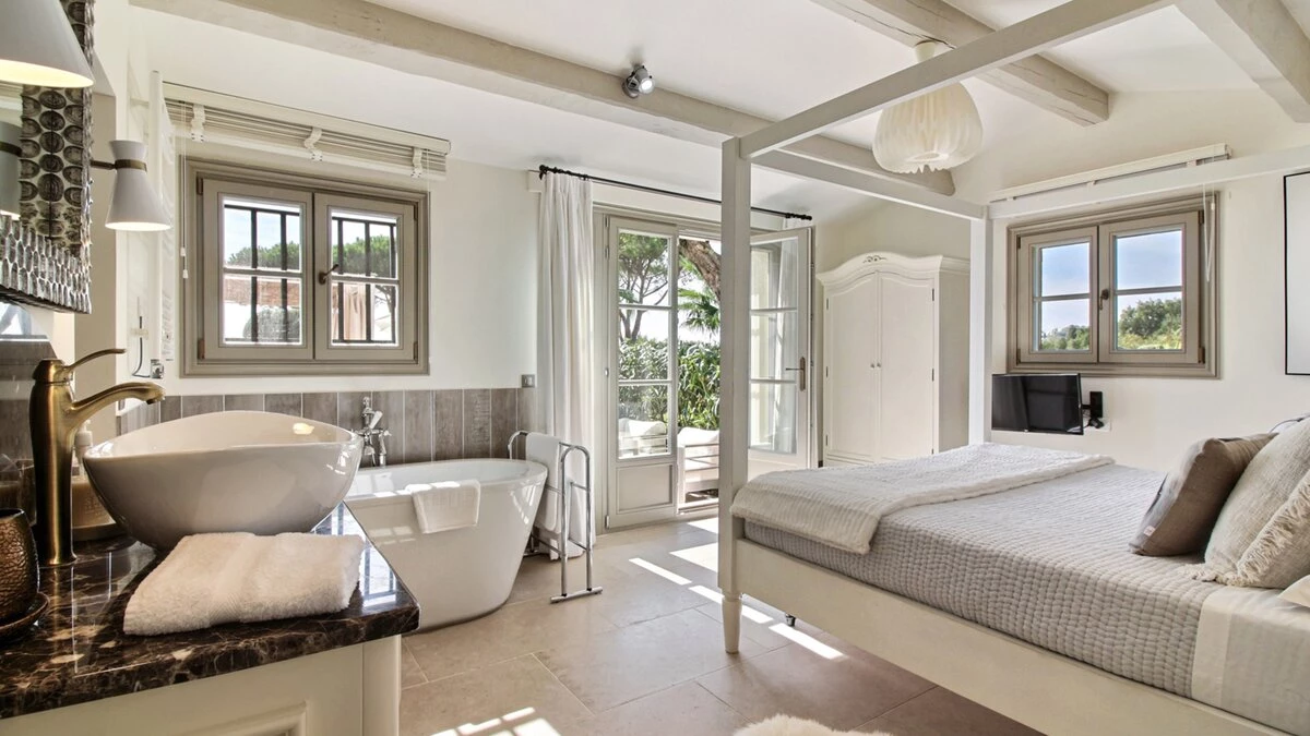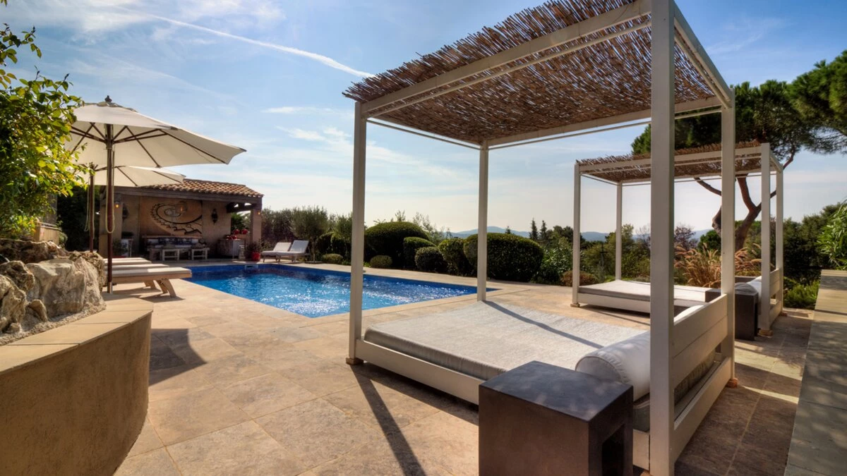 At the heart of the gardens, the heated swimming pool is surrounded by mature planting and complemented by a covered pool house, ideal for long summer afternoons. A pétanque court adds a quintessentially Provençal touch, while evenings invite al fresco dining, a glass of wine by the pool, or a gentle walk down to the beach. Villa Paradis is a calm and stylish escape on the Riviera, designed for effortless holiday living.