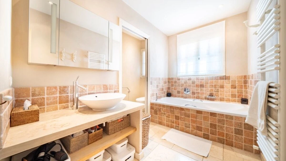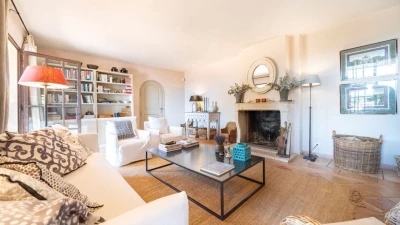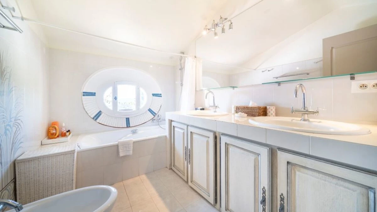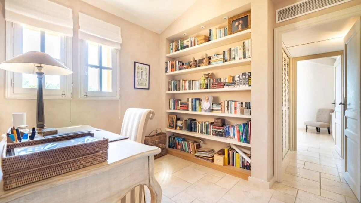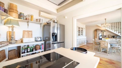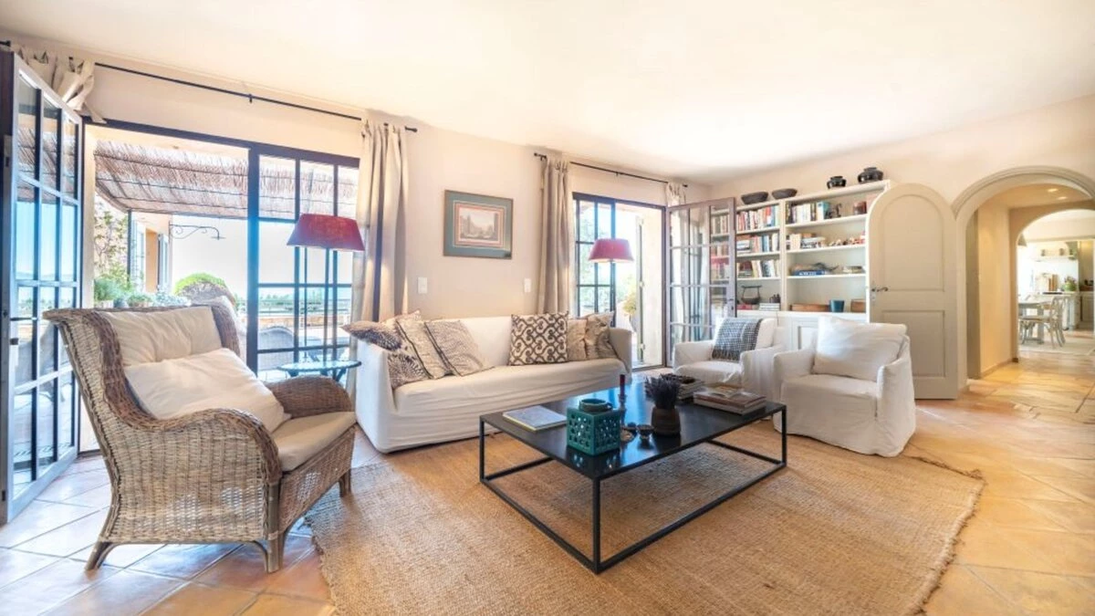 Outside, a heatable pool with Roman steps is surrounded by sunbeds, and the L-shaped terrace and shaded dining areas offer relaxed alfresco living. Olive and palm trees frame the garden, enhancing the villa’s sense of calm and privacy.