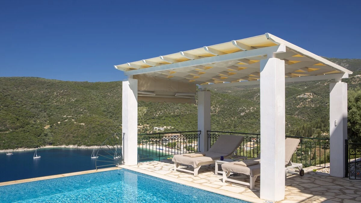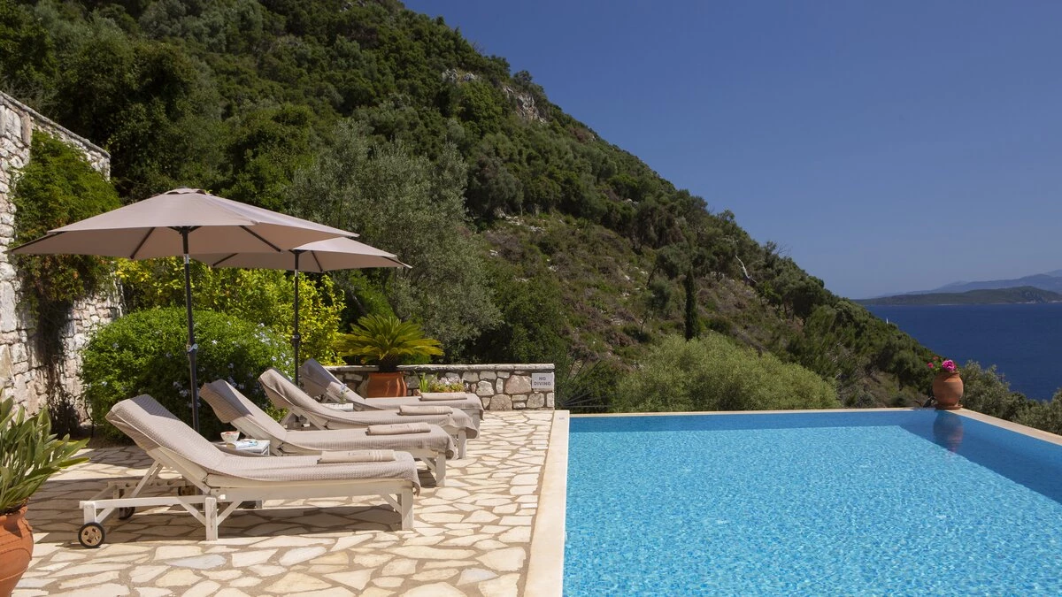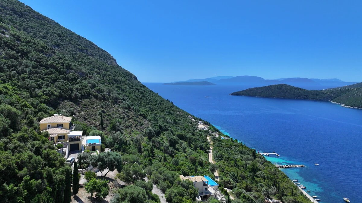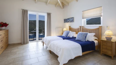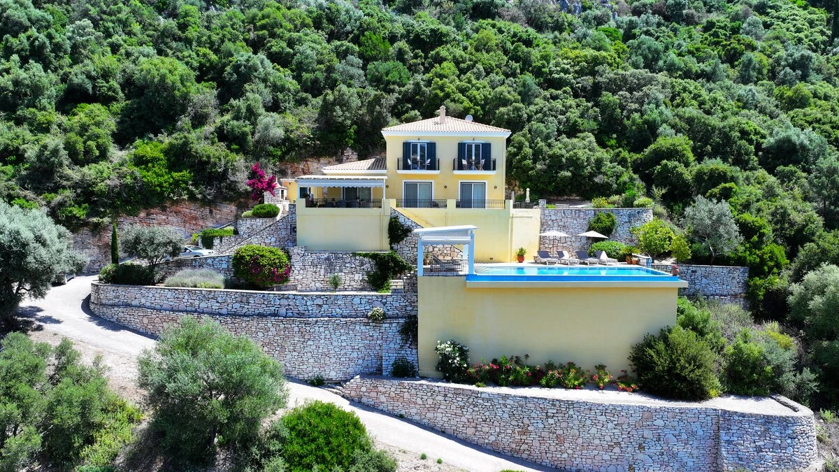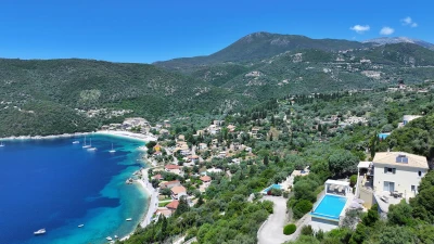 Villa Pikermi is a three-bedroom hillside retreat, perched above Rouda Bay on the southeast coast of Lefkada, Greece. With access to Mikros Gialos and its beach, restaurants and amenities. This haven for families and groups of friends offers the perfect blend of tranquillity and breathtaking views. The property's crowning glory is its spectacular panorama, encompassing the Ionian Sea, the islands of Arkoudi, Ithaca, and Kefalonia, as well as the lush forested hillsides across the bay. With its secluded location, private swimming pool, and proximity to the charming Mikros Gialos beach, Villa Pikermi puts privacy first.