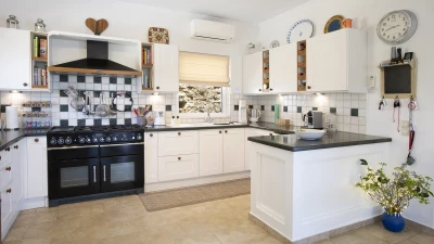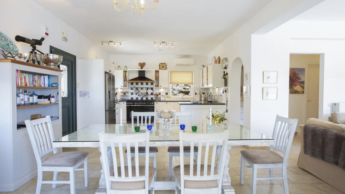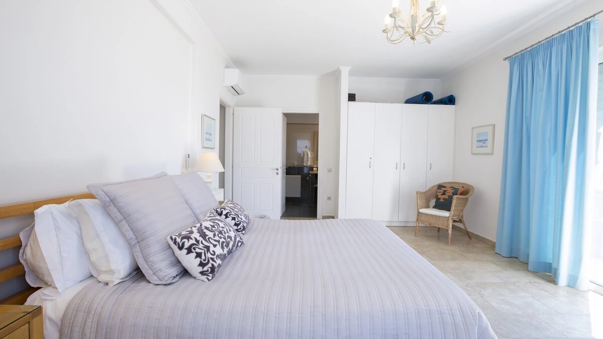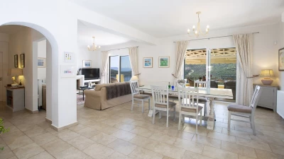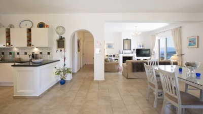 Inside the villa, thoughtfully designed interiors maximise comfort, taking full advantage of the villa's incredible setting. The ground floor features a spacious open-plan living area, combining a sitting room, dining area, and kitchen, making for the ideal spot to socialise and enjoy relaxed evenings in. One double bedroom with a bathroom en suite and separate shower is also located on this level, whilst upstairs, two flexible bedrooms can be configured with either twin or double beds, each boasting an en suite shower room. The villa is fully air-conditioned throughout, for comfort no matter the weather outside.