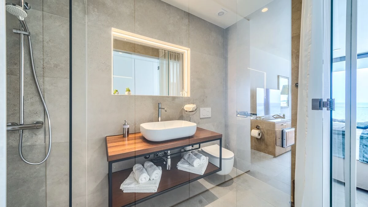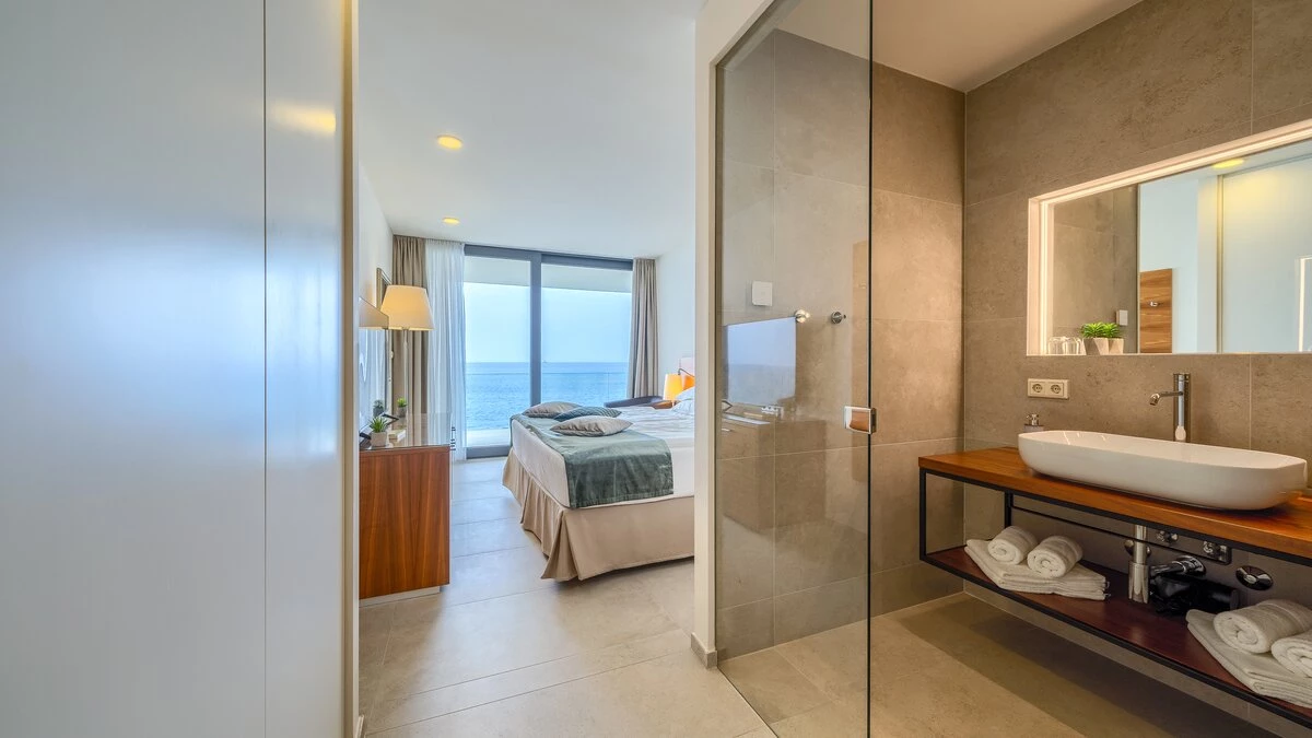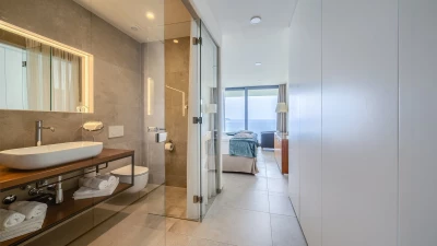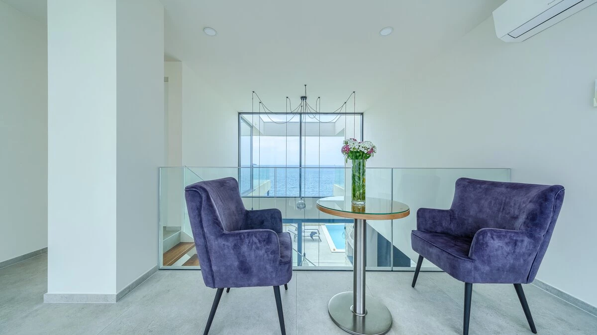 Villa Primrose is the epitome of modern design, with sleek minimalist features and an abundance of open space. Shared living areas comprise a cool living room decorated all in slate with a corner sofa positioned to admire the sea view; a beautiful clutter-free kitchen and a dining area with lovely high ceilings from which pendant lights hang and floor to ceiling windows so there’s plenty of natural light. Sliding doors open to a sprawling terrace and a heated pool with an infinity edge merging the lines of where the pool ends and the sea begins. A covered terrace provides welcome shade for dining al fresco. The property is also located next to Villa Bloom, its sister villa.