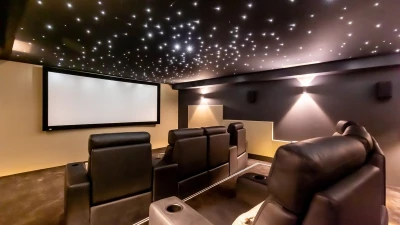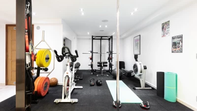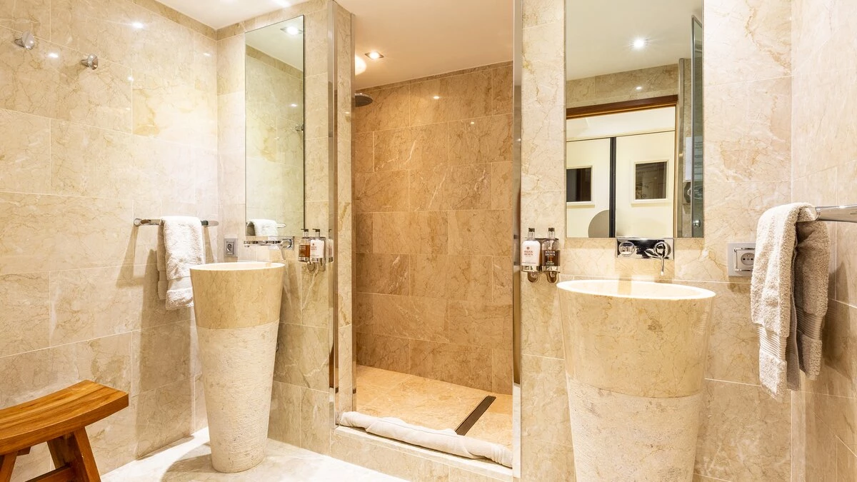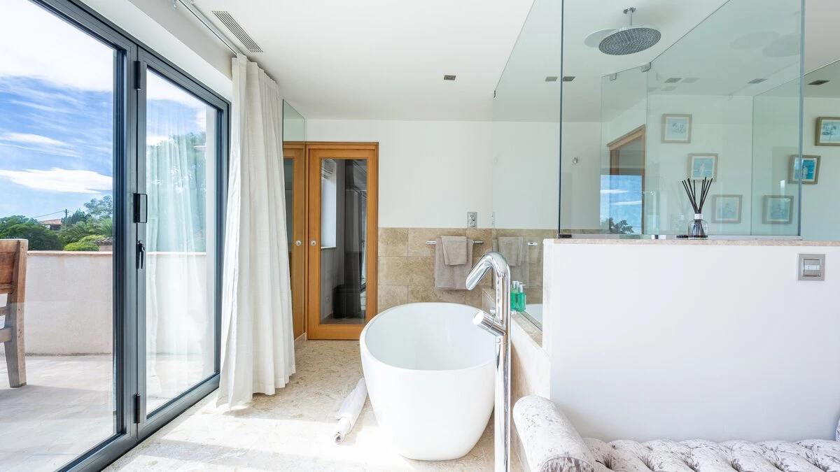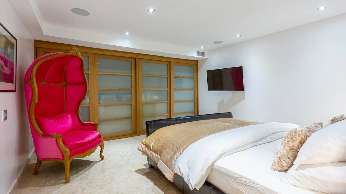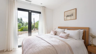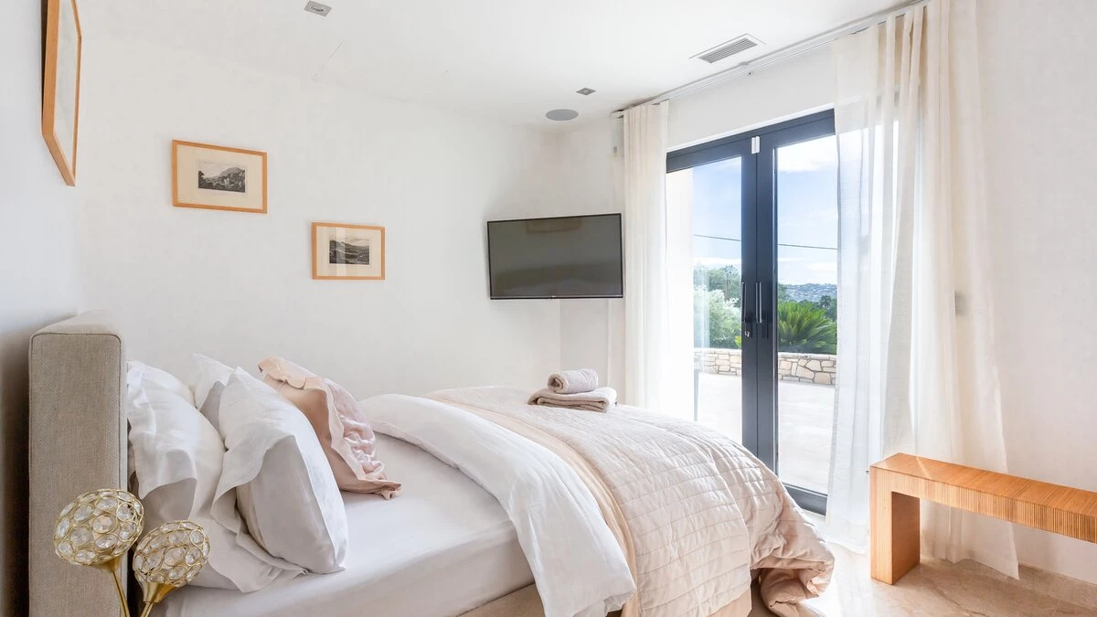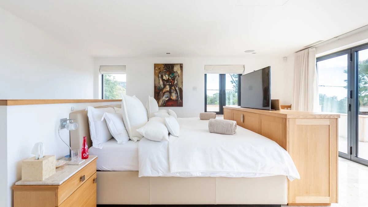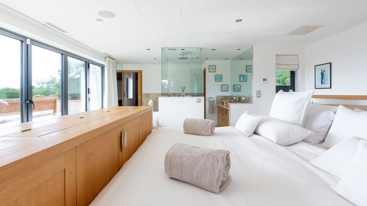 The master suite features a balcony with panoramic sea views, a dressing room, and an elegant bathroom, while two ground-floor doubles open directly onto the pool terrace. On the lower ground floor, a private bar, fully equipped gym, steam room, and 10-seat cinema room offer space for relaxation and recreation. A self-contained guest suite ensures privacy for extended stays.