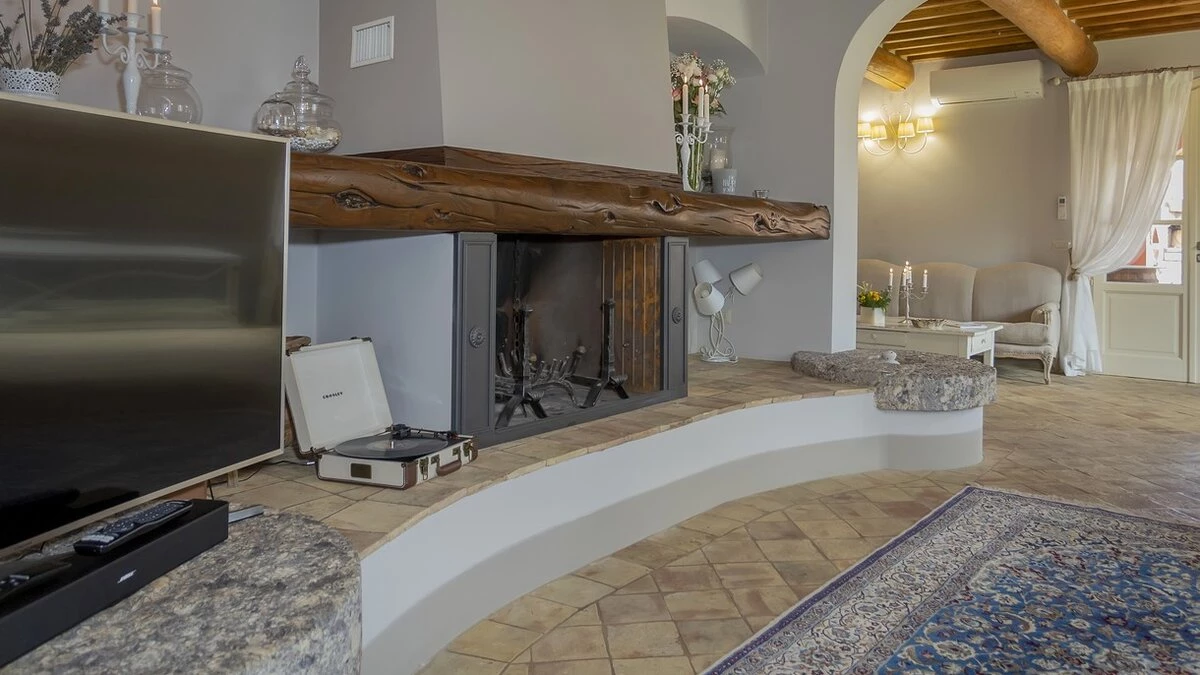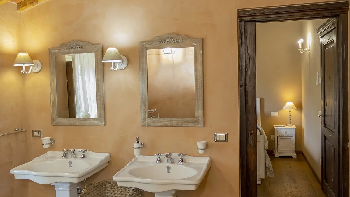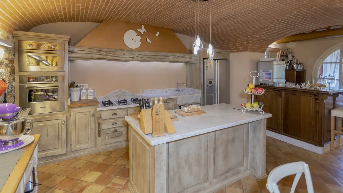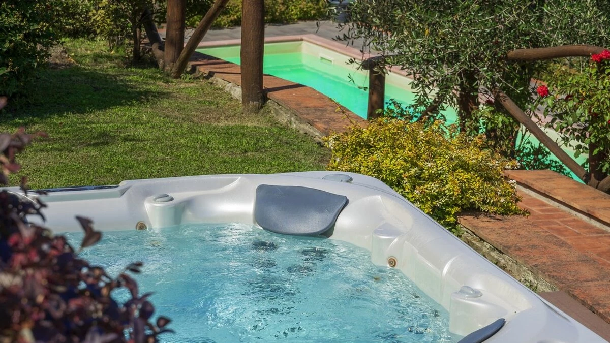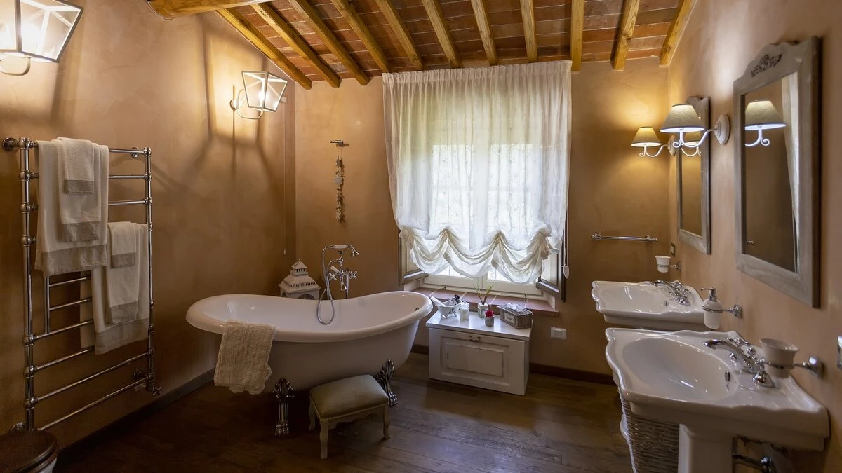 Outside scattered around the manicured gardens, there is a charming al fresco area complete with barbecue and wood burning pizza oven, a large swimming pool and Jacuzzi; all of which are surrounded by olive groves and vineyards.