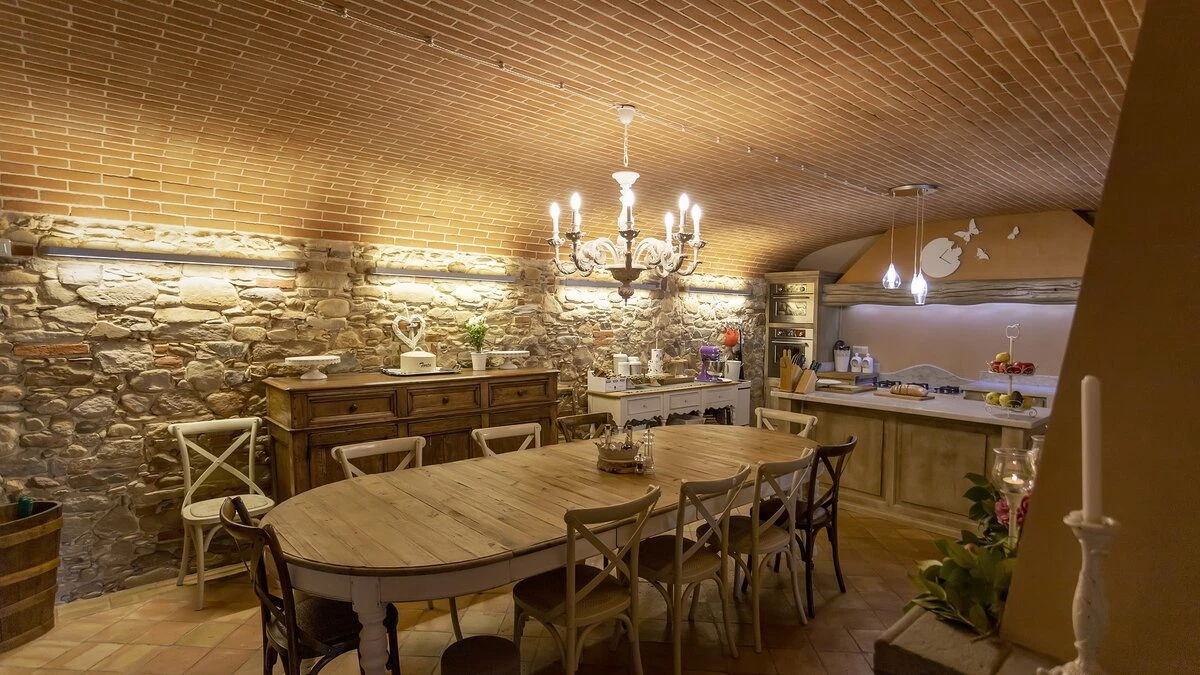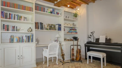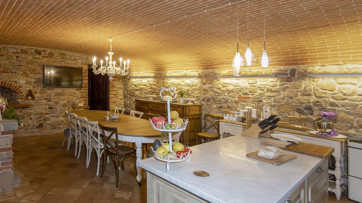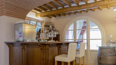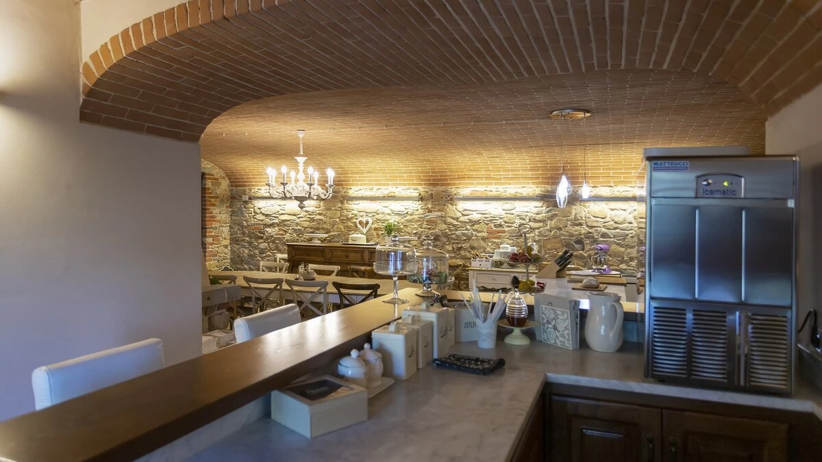 Inside through the entrance hall, guests can make use of the spacious, open plan kitchen, dining and bar area; the perfect place for socialising. With exposed brick and classic Italian styled interiors, this space holds a warming atmosphere. To the side of the kitchen there is a small coffee bar, a great spot for a morning cappuccino. Further on, there is a sitting room with library, workspace area and a double bedroom with wooden beams and shower room en suite. Each room has tasteful interiors and direct access to the outside area.