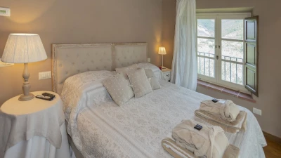 Up the stone staircase on the first floor there are an additional three double bedrooms either with shower room or bathroom en suite. All bedrooms are furnished to a high standard with beautiful wooden shutters and views of the Vorno valley below.
