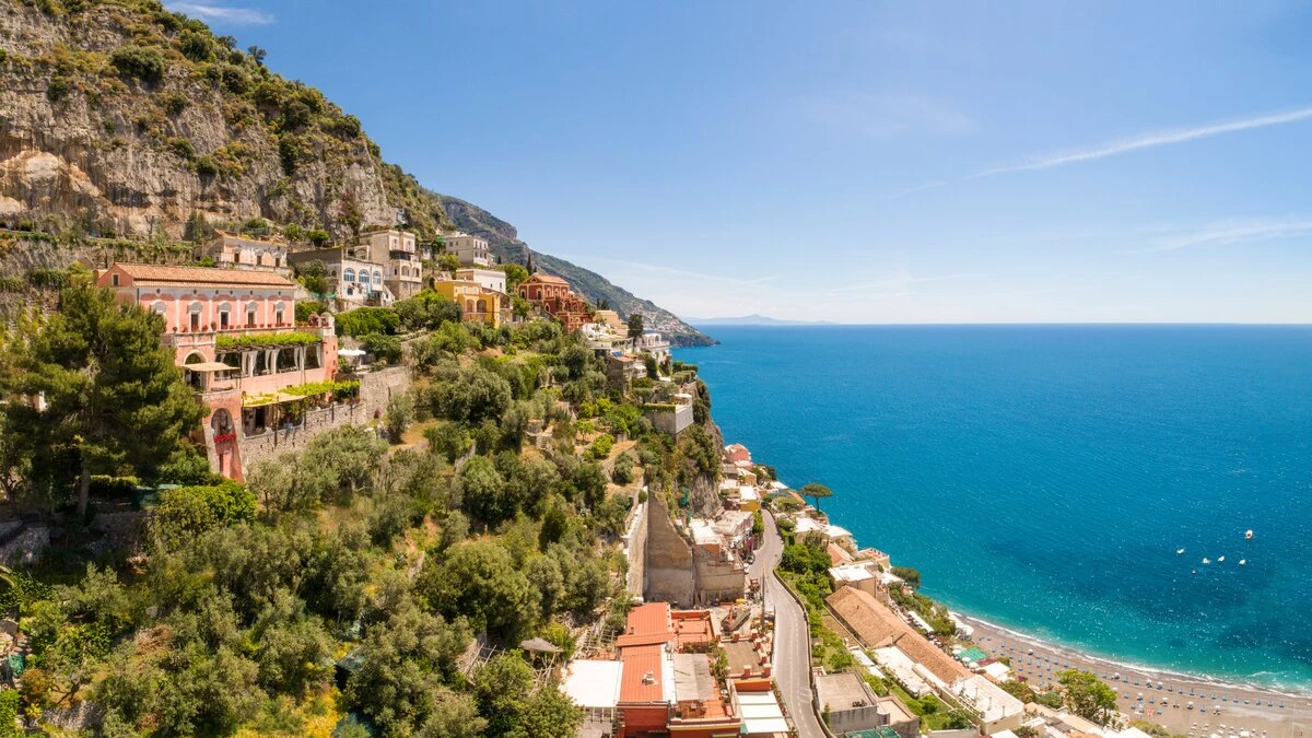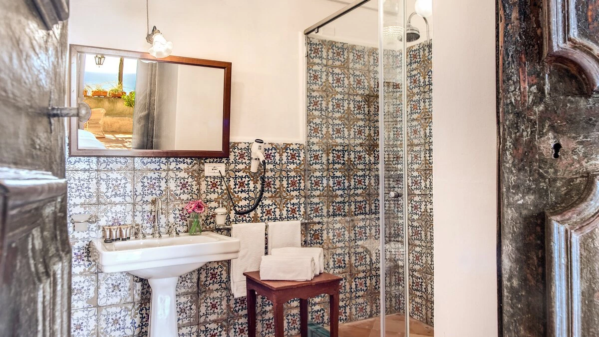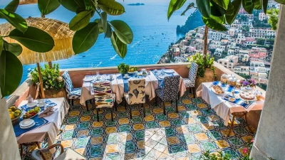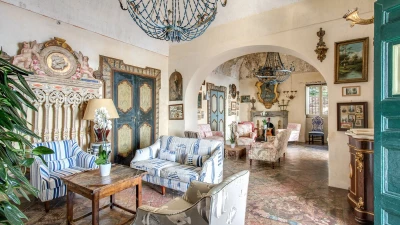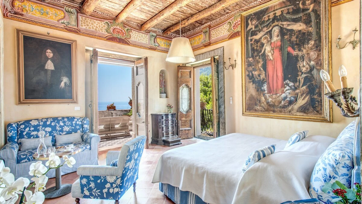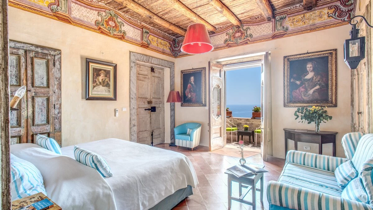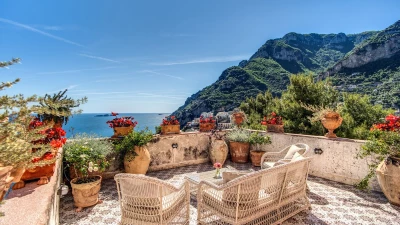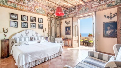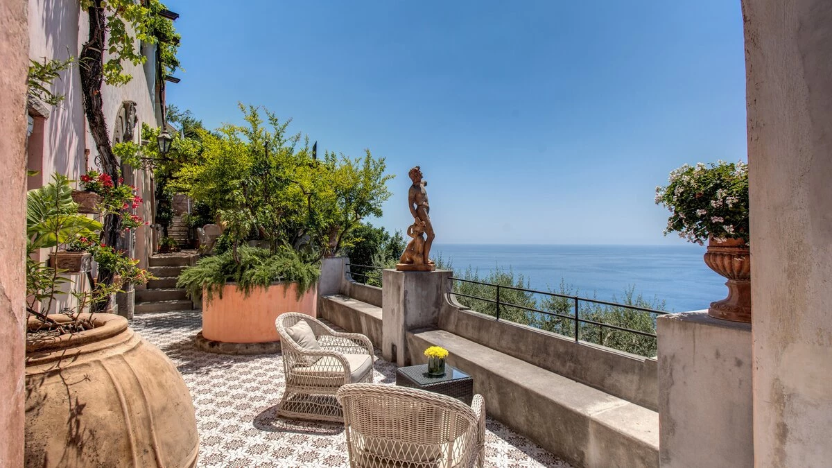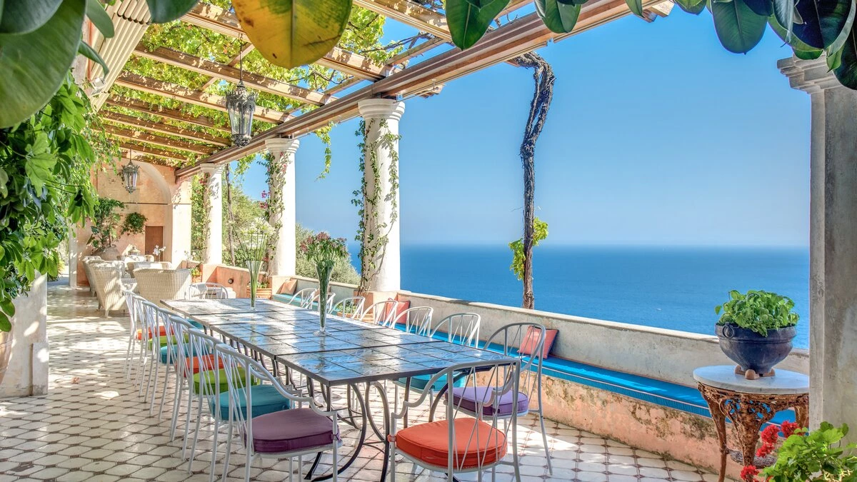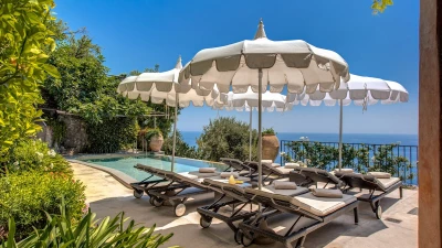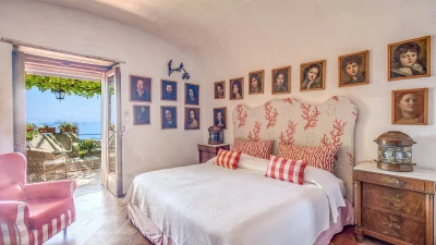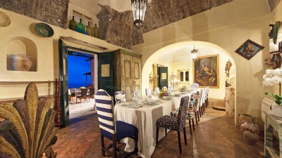 Modern amenities and high standards of service enhance the comfort and grandness at this historic house. Ornate paintwork, huge portraits, elaborate artefacts and grand chandeliers are liberally sprinkled in spacious rooms, where features include huge arches and frescoed or vaulted ceilings. The gorgeous kitchen is brimming with old world character but replete with modern appliances. In the open-plan sitting/dining room, colourfully mismatched furniture and fabrics create a feel of arty informality, complemented by a Bose sound system, WiFi and large screen satellite TV. And each of the twelve bedrooms has air conditioning and en suite bathrooms. Tiered into the steep slopes, the villa’s outdoor areas all enjoy superb sea views and include a lovely lawned garden with dappled tree shade; a little breakfast area, styled with fun fabrics and bright floor tiles; a large shaded terrace, elegantly furnished for dining and relaxing al fresco; and a private infinity pool in a prettily planted patio. And all this is just a ten minute walk from Positano centre.
