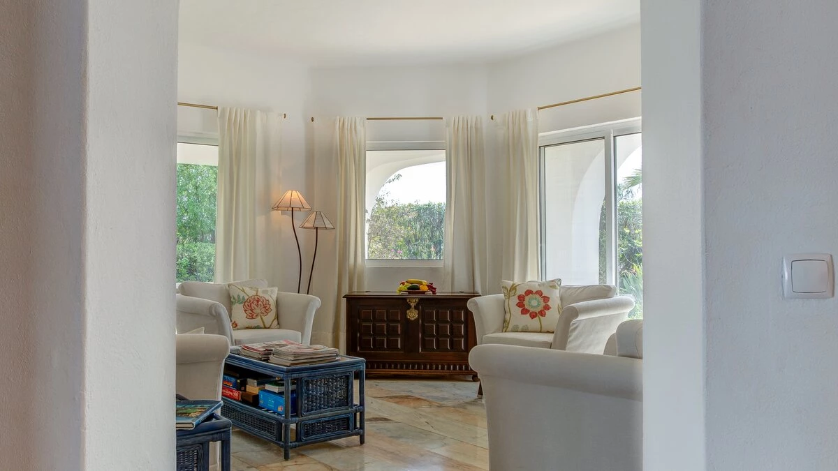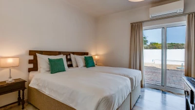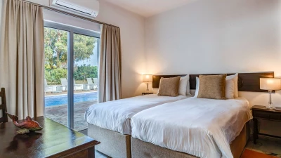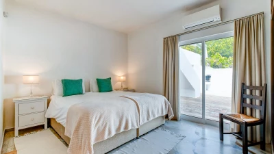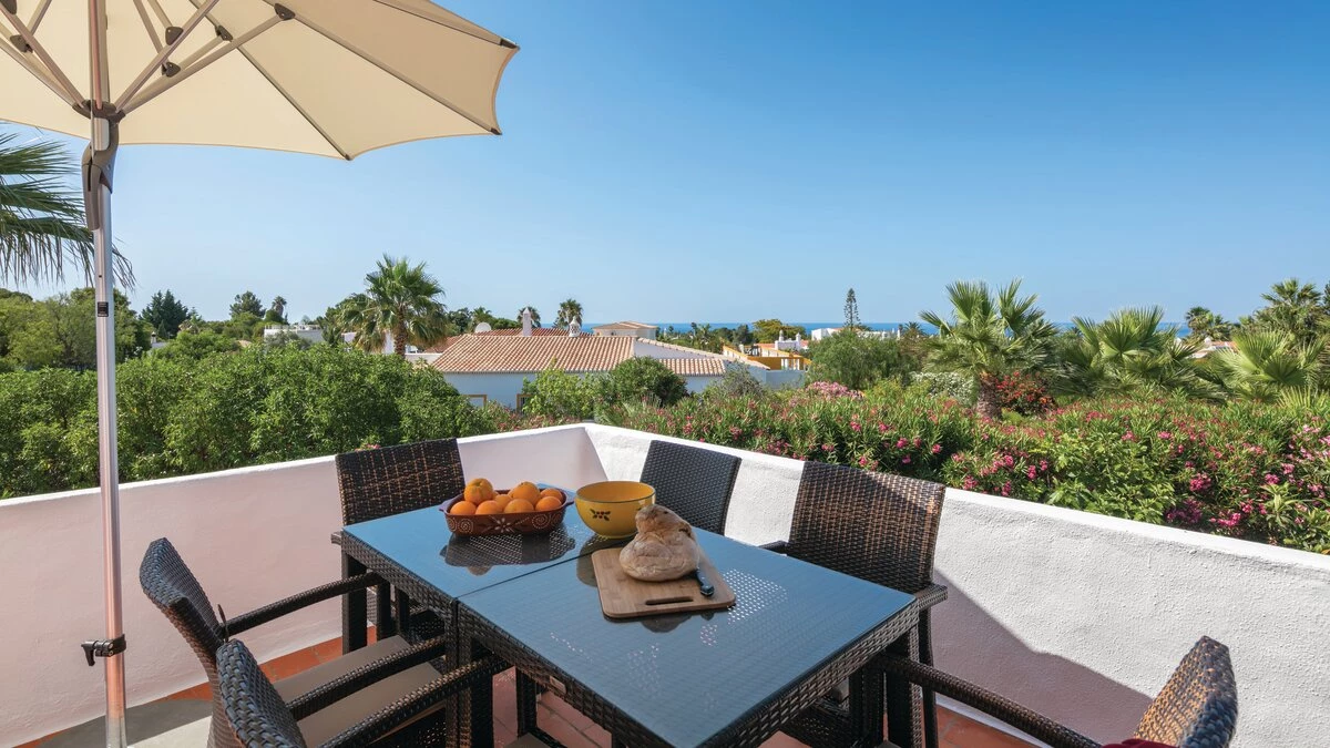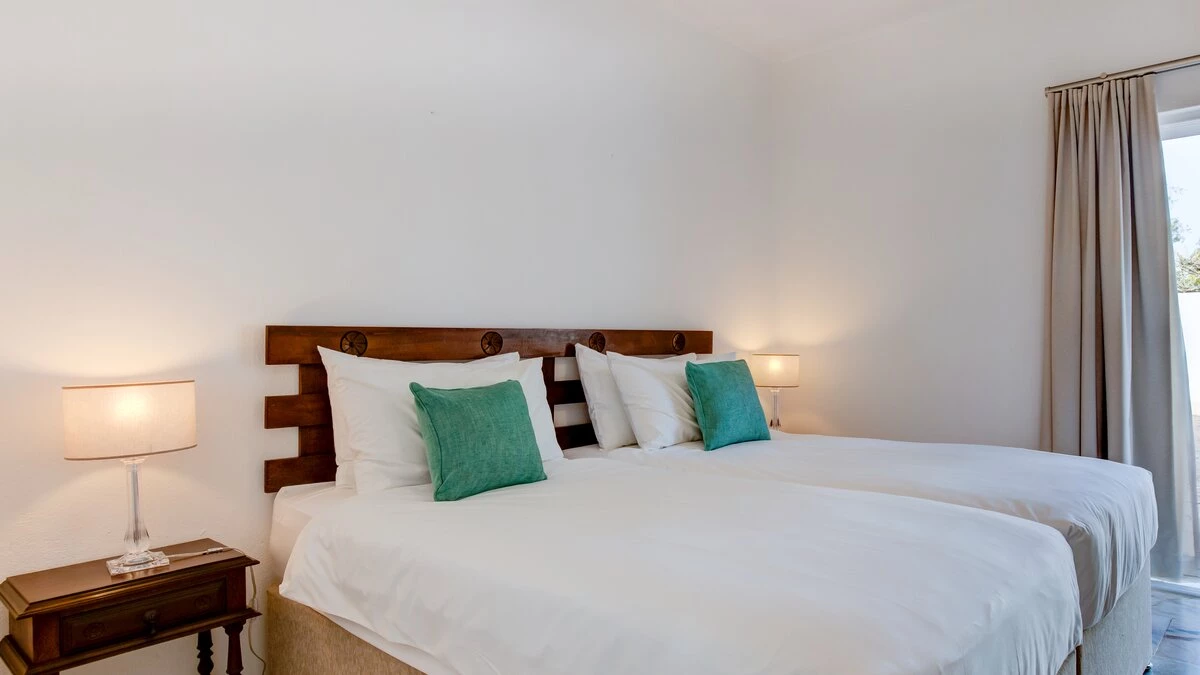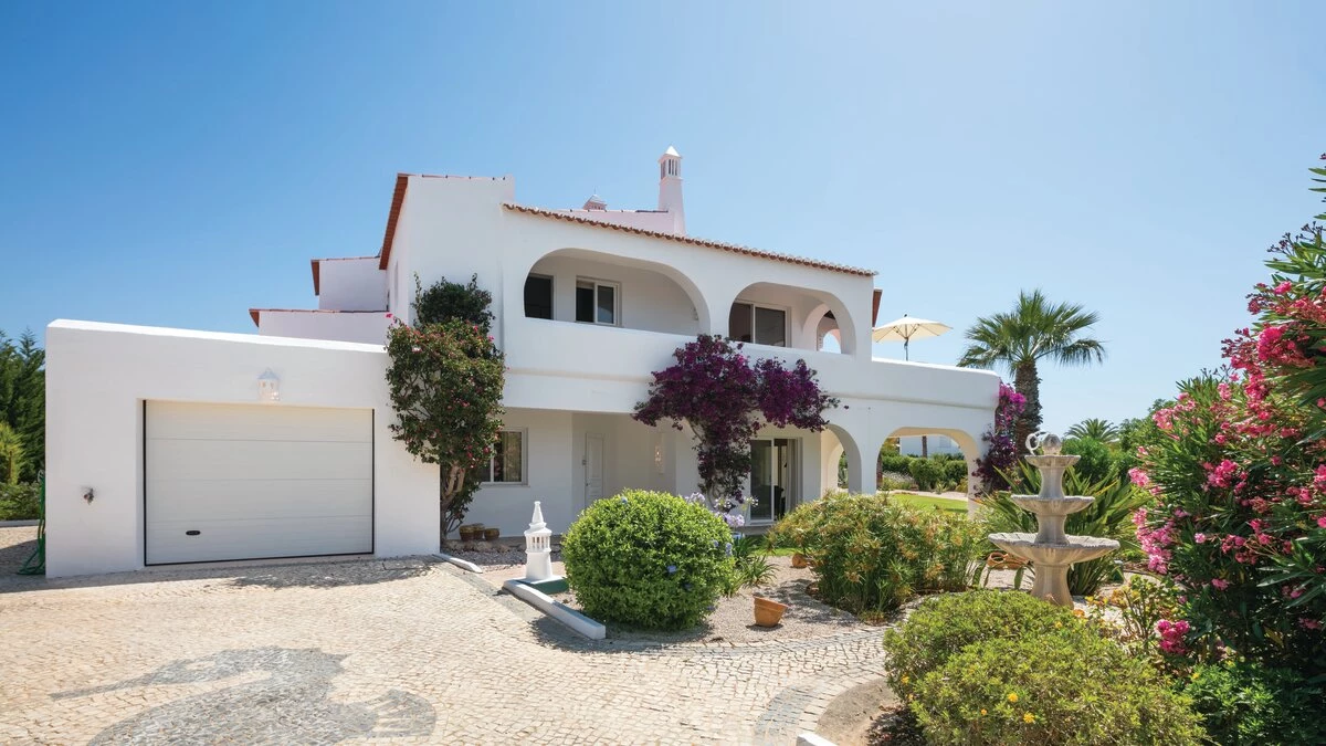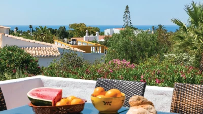 Not far from some of the Algarve’s best beaches, this classic-style villa is a great example of traditional Portuguese style. It’s rounded and whitewashed, with a gorgeous but simply styled exterior, and there’s a huge wrap around terrace that basks in the first floor views of the ocean and garden. Bougainvillea-blessed gardens are beautifully well-kept, and there’s a heavenly blue-tiled swimming pool out back (available to be heated for an extra cost). With lots of loungers and brollies, there are plenty of sunbathing spots on the huge sun terrace, alongside a lovely outdoor table for al fresco summer meals. Inside, the villa represents a mix of traditional Moorish style with contemporary comforts. It’s traditional but classic, with lots of antique features and pared-back walls. The main living areas can all be found on the first floor – there’s a modern kitchen with a breakfast bar and access to the veranda for the great sea views, plus a large living/dining area with high ceilings and a contemporary smart TV. There is also a guest toilet with shower on this floor. Head downstairs for the bedrooms – there are two twins with a shared bathroom, and a master king size double bedroom with a modern en suite walk-in shower room. All of the rooms follow a similar traditional style, and include patio doors that lead out to the pool or lovely garden.