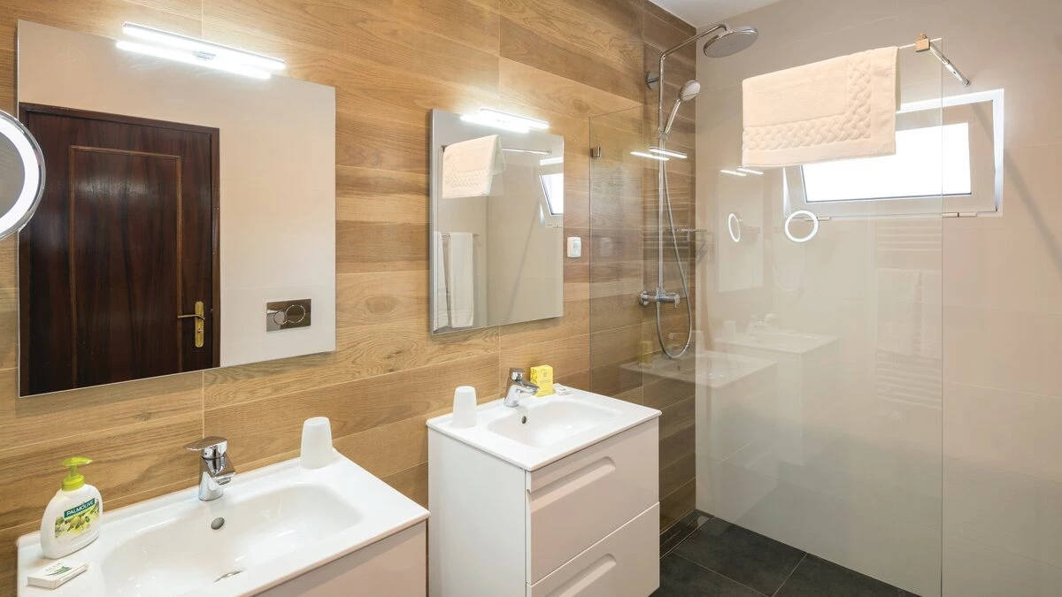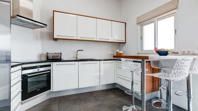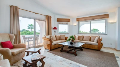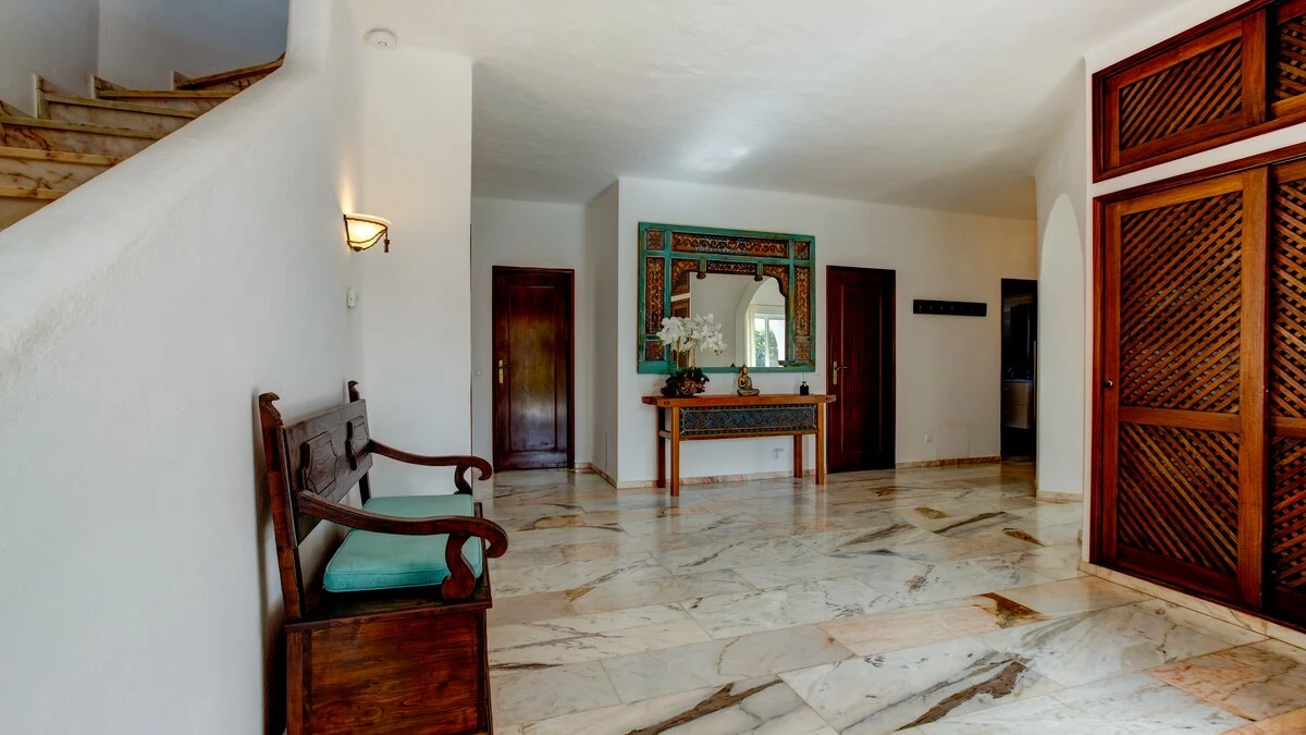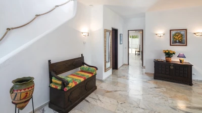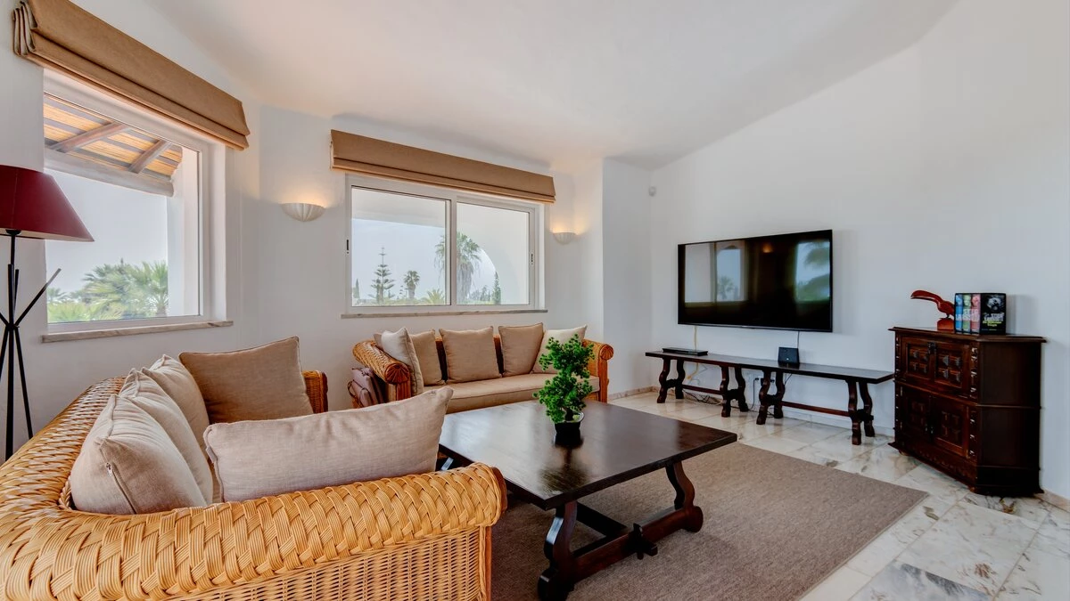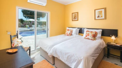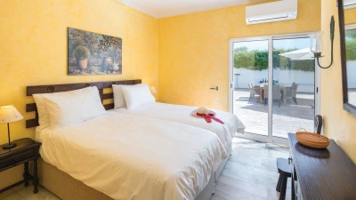 Not far from some of the Algarve’s best beaches, this classic-style villa is a great example of traditional Portuguese style. It’s rounded and whitewashed, with a gorgeous but simply styled exterior, and there’s a huge wrap around terrace that basks in the first floor views of the ocean and garden. Bougainvillea-blessed gardens are beautifully well-kept, and there’s a heavenly blue-tiled swimming pool out back (available to be heated for an extra cost). With lots of loungers and brollies, there are plenty of sunbathing spots on the huge sun terrace, alongside a lovely outdoor table for al fresco summer meals. Inside, the villa represents a mix of traditional Moorish style with contemporary comforts. It’s traditional but classic, with lots of antique features and pared-back walls. The main living areas can all be found on the first floor – there’s a modern kitchen with a breakfast bar and access to the veranda for the great sea views, plus a large living/dining area with high ceilings and a contemporary smart TV. There is also a guest toilet with shower on this floor. Head downstairs for the bedrooms – there are two twins with a shared bathroom, and a master king size double bedroom with a modern en suite walk-in shower room. All of the rooms follow a similar traditional style, and include patio doors that lead out to the pool or lovely garden.