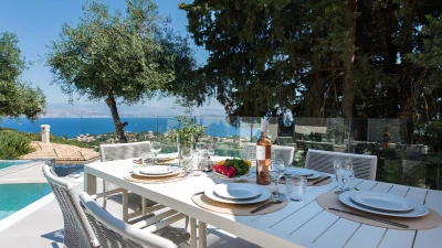Outside, guests can enjoy a beautifully spacious pool area, with an infinity pool overlooking the sea. There is also a lovely dining space with a barbecue, alongside several spaces to lounge about and soak in the sun. The villa is just 1.5km away from restaurants, bars, supermarkets and nightlife in Kassiopi.