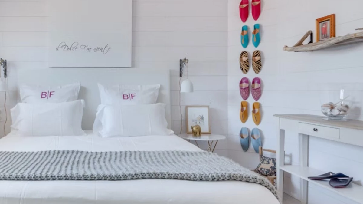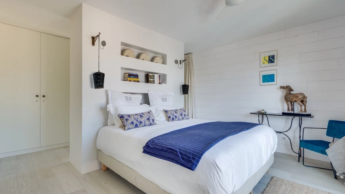 Inside, the villa is bright, spacious, and inviting. The living and dining areas open seamlessly onto the sun-soaked garden, pool, and covered terrace, where al fresco dining and relaxed lounge moments come naturally. A small adjoining living room can be transformed into a double bedroom with an en suite shower, offering flexibility for families or friends. Upstairs, three king-size bedrooms and a twin room provide adaptable sleeping arrangements, ensuring every guest feels at home.