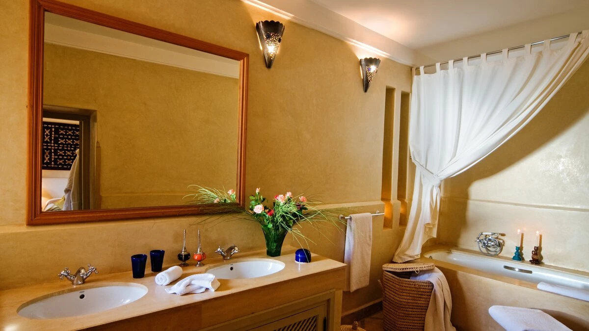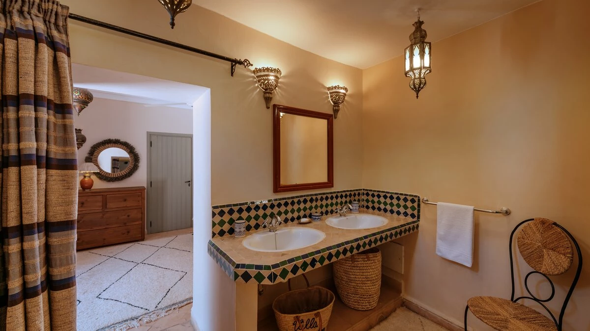 Villa Tamara is an impressive country house, situated 13 kilometres south of Marrakech on the road to the Ourika Valley and the Atlas Mountains. It is a twenty-minute drive from the centre of town and the airport. This wonderful house is suitable for all ages from small babies to less active grandparents. Built by a French Colonel in 1925, the style is now mainly Mediterranean which complements the high ceilings and light, spacious rooms. Traditional decorating techniques have been used; Tadelakt (polished plaster) works well alongside Zelige tiles, Diss and Bejmatt local bricks. The ceilings in the villa are 5 metres high, and the walls 0.5 metres thick which provides great insulation from the heat, and the chill of winter’s evenings.