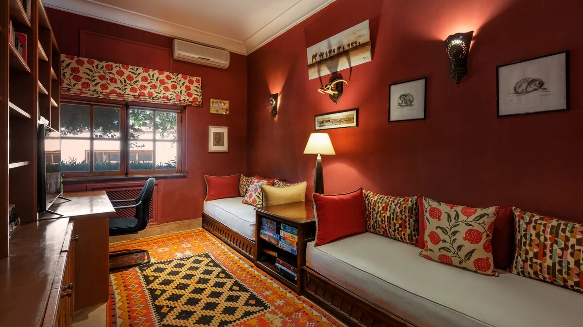 Within the main house, there is a large entrance hall leading to the Dining Room which seats up to 14 guests. The Drawing Room has a log fire which is lit on winter days and evenings if required. The drawing room has 1930’s Egyptian wall hangings, and antique textiles collected by the family blend beautifully with mother-of-pearl inlaid Syrian mirrors and furniture. French doors lead out onto the terrace, with a seating area and bougainvillea covered pergola which provides shade for one of the dining table.