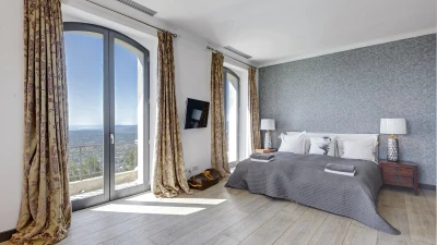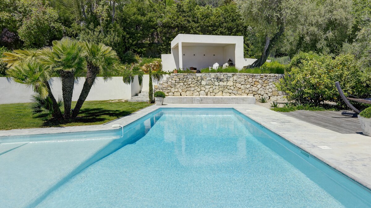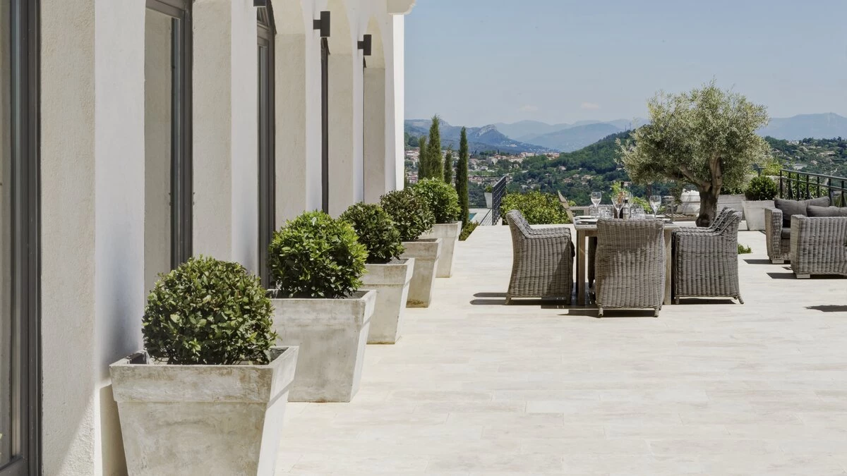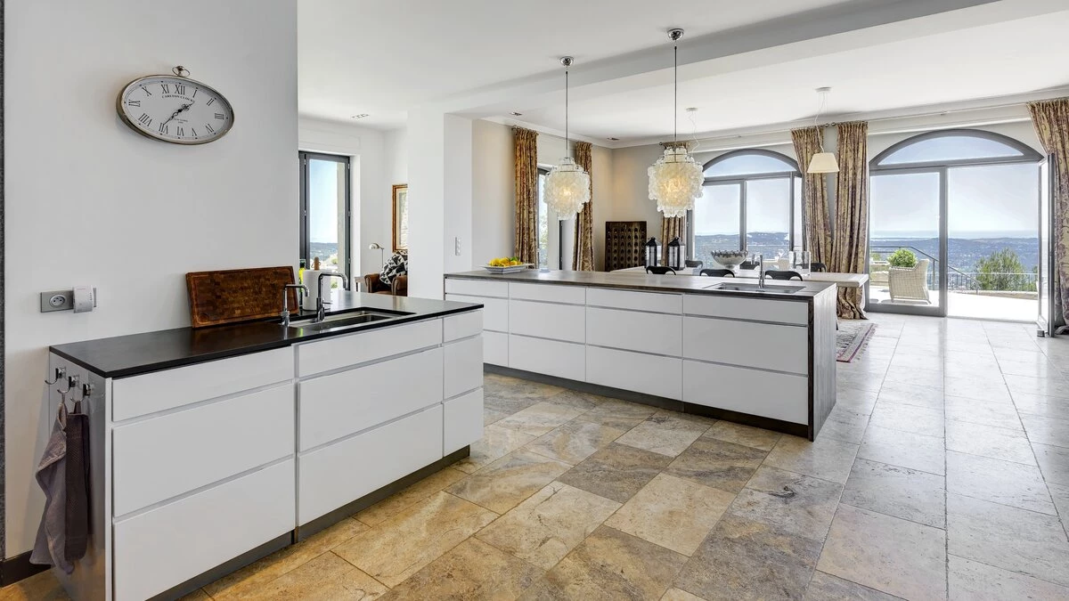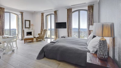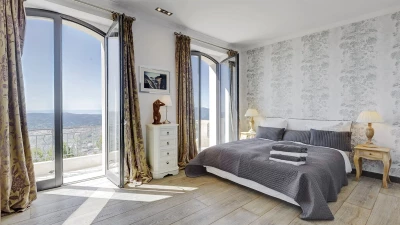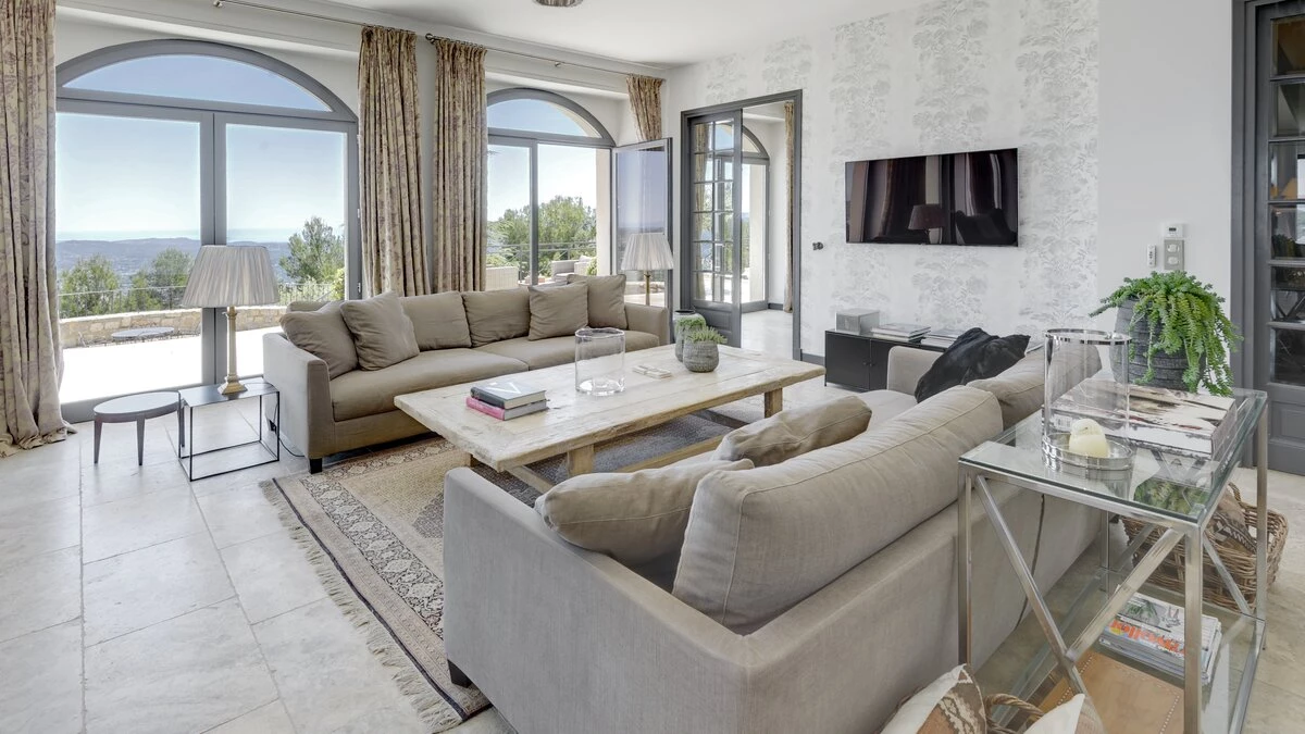 This pretty villa is perched on a hillside boasting incredible panoramic views of the countryside below out towards the Bay of Cannes. The grounds have been flawlessly planned to take full advantage of the property’s position, with the lawned gardens and the enviably large swimming pool enjoying uninterrupted views across the bay. A decking area adjacent to the pool has soft seating; an excellent spot to relax with a glass of local wine and admire the vistas, while the outdoor dining area looking across to the sea is perfect for an al fresco dinner from the barbecue. Inside, the ground floor houses a large open-plan living area, with lounge, dining space and a well-equipped, modern high-gloss kitchen. Floor to ceiling glass doors line the room, flooding the space with light and opening out to the terrace. Upstairs you’ll find the sumptuous master suite, with two sets of huge glass doors bringing the views inside, and a deluxe en suite bathroom with twin sinks, free-standing bath and separate shower. There are a further two bedrooms, both with well-appointed en suite shower rooms, and an office on the ground floor can be made into a twin room for two children if required. The interiors are finished to an extremely high standard, with a mix of modern and classic furnishings, and neutral colour palettes and luxe fabrics throughout.