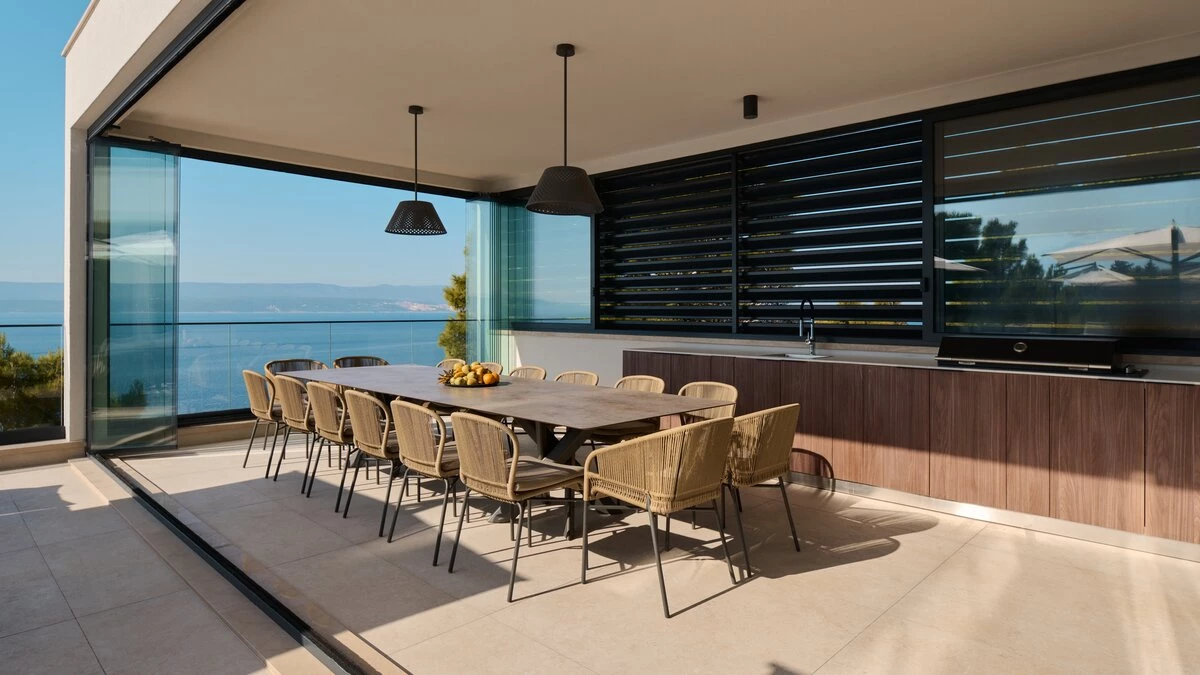 The exterior of Villa Venus features an infinity pool, providing a refreshing retreat for sunny days, adorned with sun loungers and umbrellas. Located within walking distance of the beach and local restaurants, guests can easily explore the area at their own leisure. For adventure seekers, activities like climbing and rafting are available nearby. A short fifteen-minute drive leads to the charming fishing village of Omiš, while the vibrant city of Split is just a bit further up the coast, making Villa Venus an excellent base for experiencing Dalmatia.