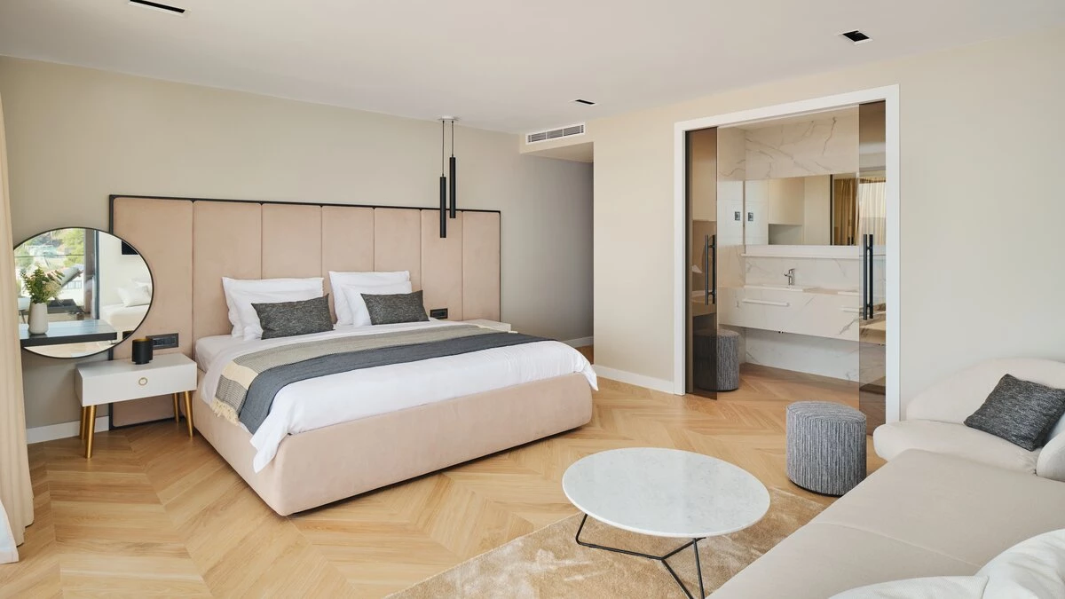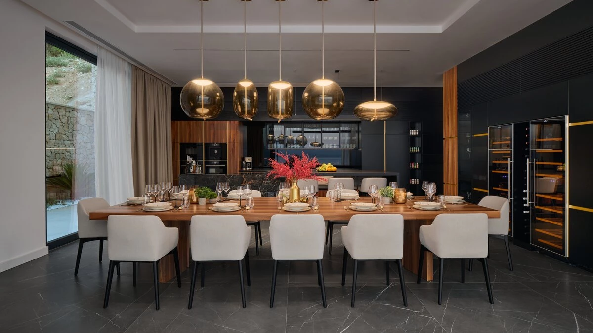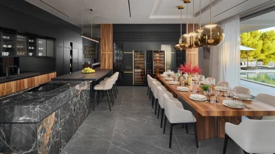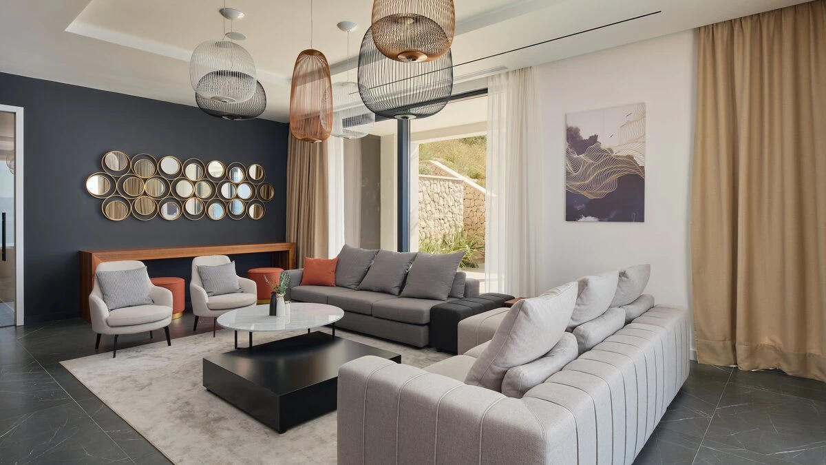 Inside, Villa Venus showcases modern design with artistic touches, adding to the sense of grandeur, sophistication, and style. The bright living areas are furnished for comfort, while the eight bedrooms ensure privacy with their own en suites. Four of the bedrooms provide direct access to the terrace and private Jacuzzis, perfect for unwinding after a day of exploration. The villa’s sleek kitchen is ideal for preparing home-cooked meals, whilst the spacious terrace features a covered outdoor kitchen and dining area, perfect for enjoying al fresco meals with loved ones, accompanied by an unforgettable backdrop. The villa also boasts a dedicated home gym for fitness enthusiasts, and a chic indoor pool area.