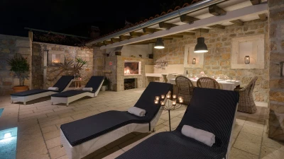 Outside a heated pool takes centre stage within a pretty private courtyard. Luxurious loungers are poised poolside to enjoy the breathtaking view, while a shaded dining terrace is served by a traditional stone built BBQ and outdoor kitchen.