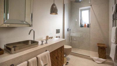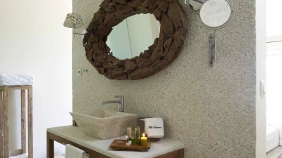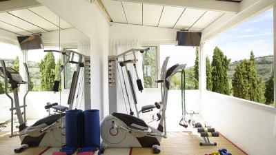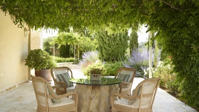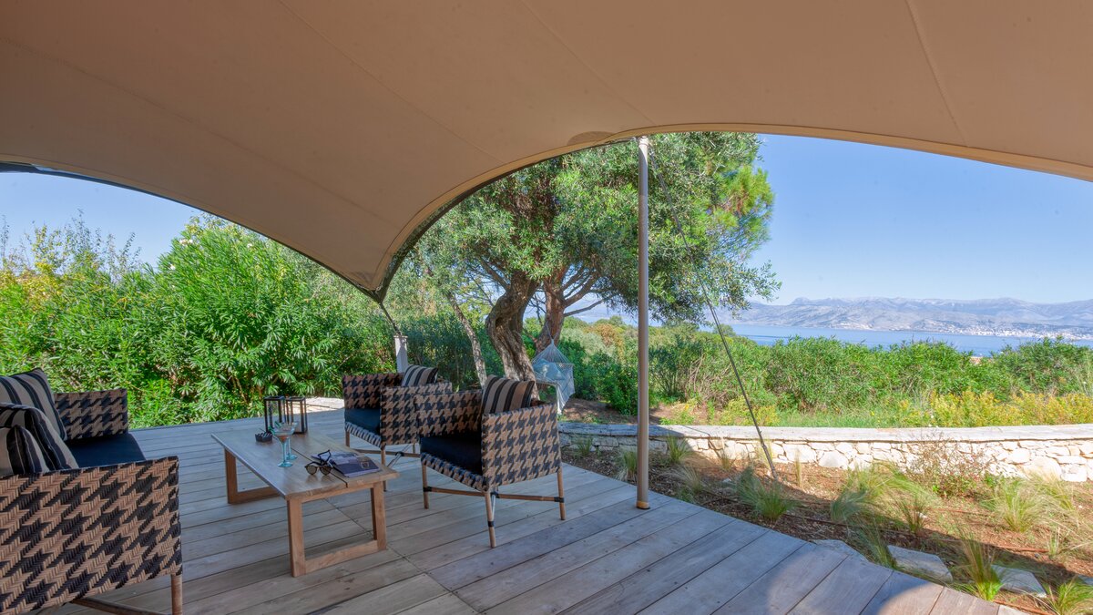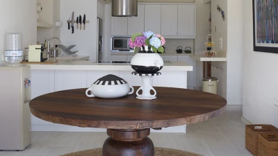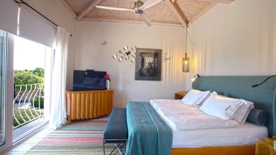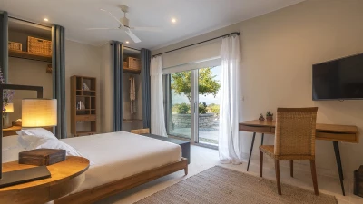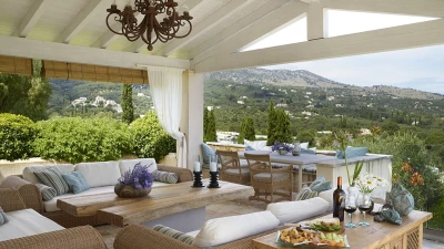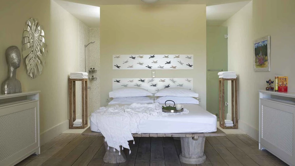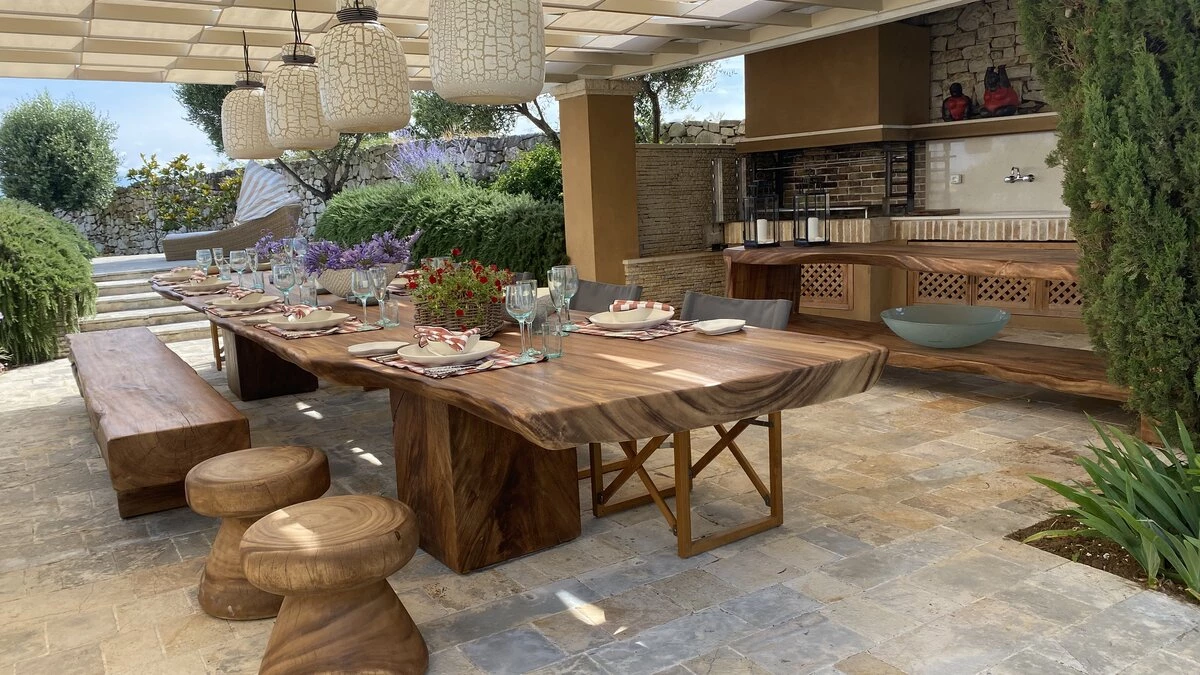 Inside, the interiors are both sophisticated and serene, featuring an expansive open-plan living area, and carefully curated modern furnishings. The villa also features five beautifully appointed en suite bedrooms across the main house, as well as a unique glamping-style suite within the landscaped gardens, while a private gym offers the opportunity to maintain wellness routines in style.