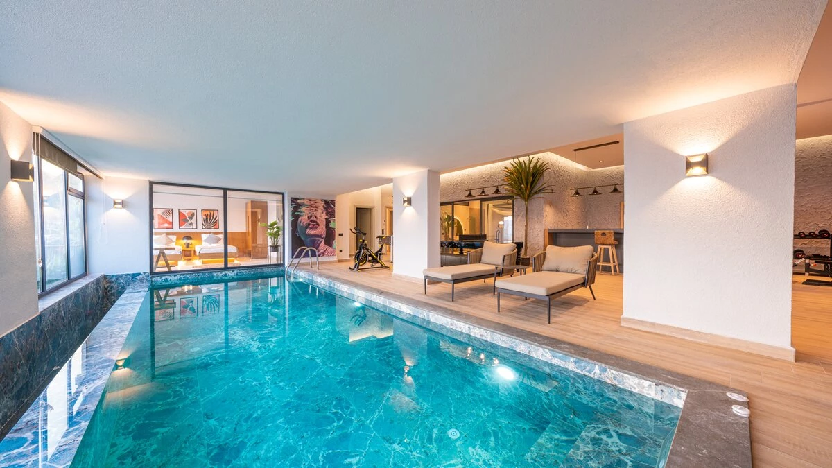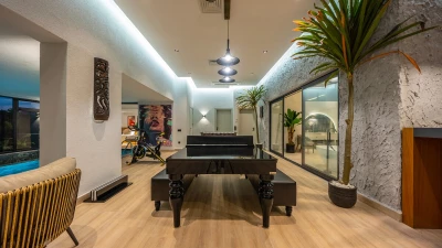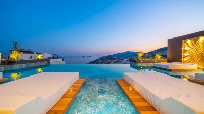 Villa Yildiz is a strikingly modern, newly built property located in Kalkan, offering incredible views out to sea and across the town. The three-storey villa is positioned to make the most out of Turkey's stunning sunsets, and is exceptionally spacious to accommodate large groups and families. On the ground floor, guests will be impressed by a sleek and large open plan living room, dining room and kitchen. The design is contemporary with tasteful neutral tones, plants and large windows displaying beautiful seascapes. There is ample entertainment to keep the party occupied on the lower ground floor, including an indoor pool, gym, pool table and bar. The hammam and sauna provide the perfect space to relax and recharge.