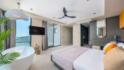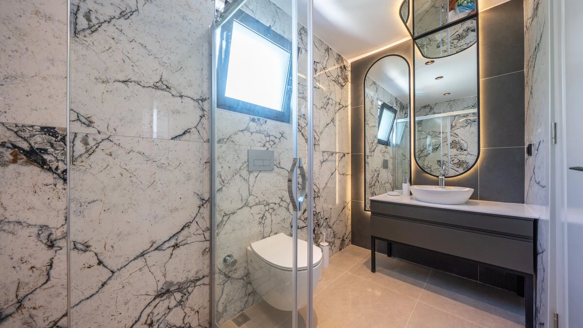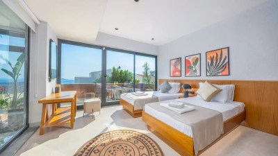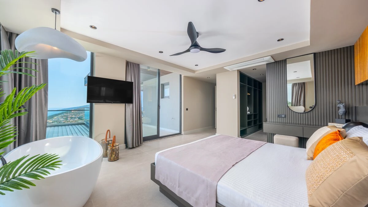 This floor features a king-size double bedroom with a stylish en-suite shower area, seamlessly integrated into the bedroom for a modern, open-plan design, while there is also a twin bedroom with a shower room en suite. On the first floor, three bright and airy bedrooms are each complete with a shower room en suite and extraordinary views of Kalkan.