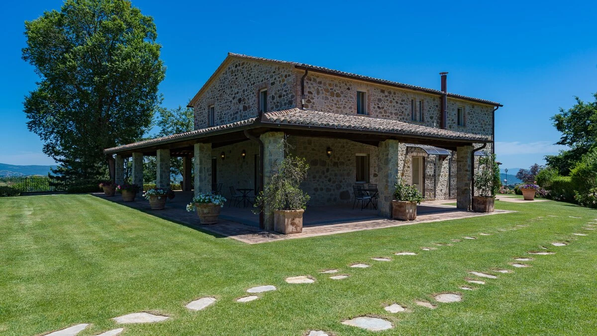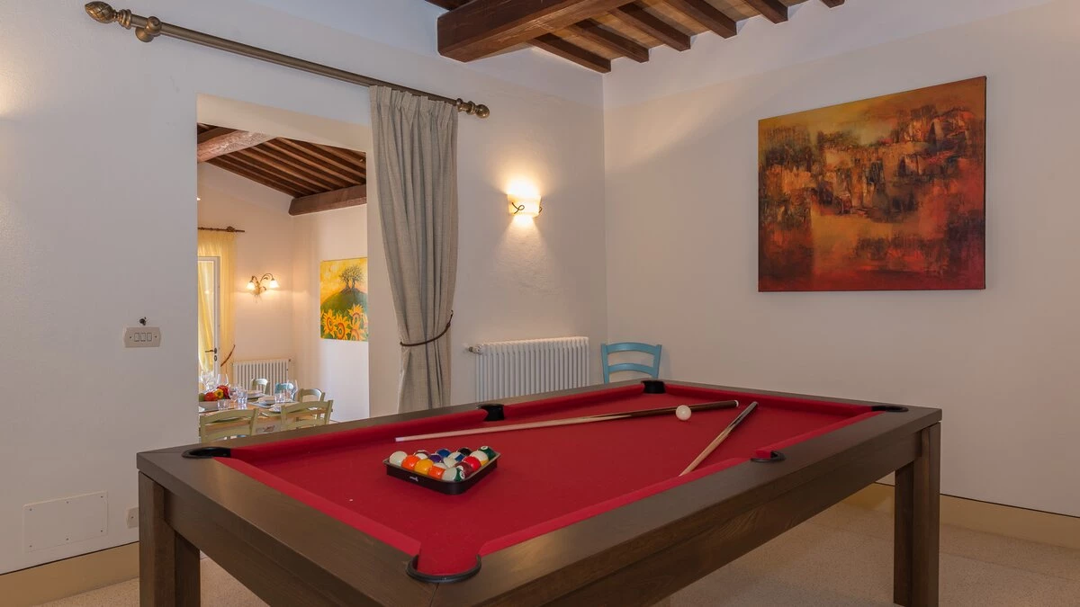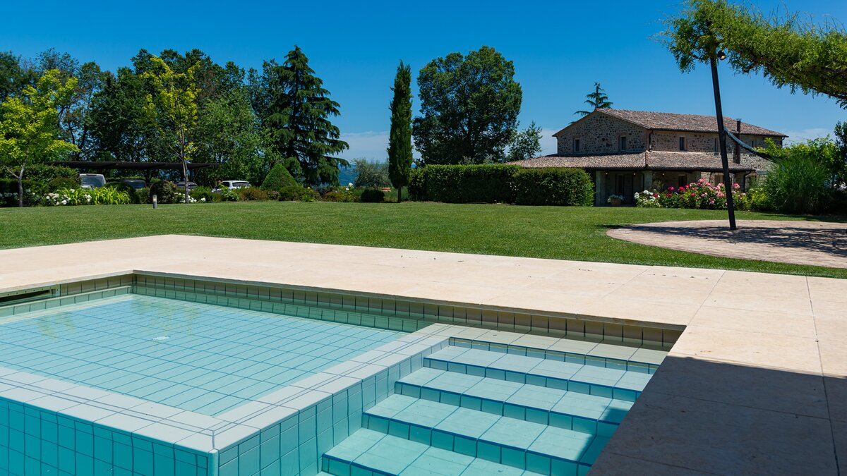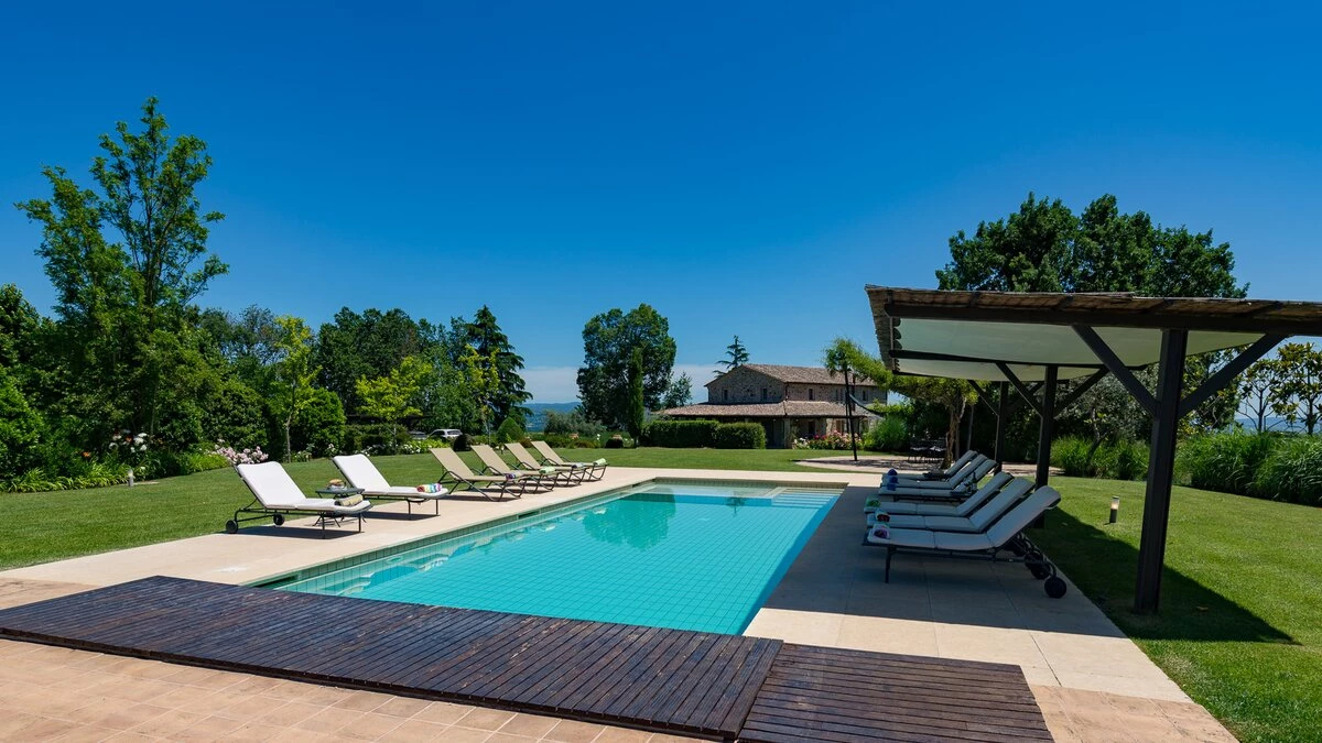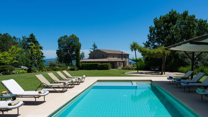 Set in the heart of Umbria’s countryside, Villa Zafferano has been beautifully transformed into a very spacious luxury villa for parties looking for a spacious and very private villa of very high standard. Encircled by beautiful mature gardens with breathtaking views, there are very extensive outdoor spaces at the villa including a vast lawned area with football goal behind the pool; a barbecue area, an al fresco dining area and ample tables and soft seating to relax and appreciate the far reaching views that stretch over the hills towards the city of Orvieto, clearly visible in the distance. The spacious interiors are carefully furnished in a contemporary style with light colours and beautifully appointed bathrooms. On the ground floor, there is ample kitchen, dining and living space and a TV room and room with pool table. There is direct access to the terrace, leading to the al fresco dining table and terraces with soft seating. Two double bedrooms with shower rooms en suite opening to the gardens complete the lower level of the villa. The first floor consists of four large bedrooms: a spacious double bedroom with shower room en suite, and a spacious twin bedroom with en suite bathroom and separate shower on one side of the villa and another spacious double with en suite shower and twin bedroom with en suite bath and shower located on the other side of the villa, making this an ideal choice for families travelling together. Cook service is available on request and Villa Zafferano is a short drive from Fabro and Allerona and 25 minutes from the lovely city of Orvieto.