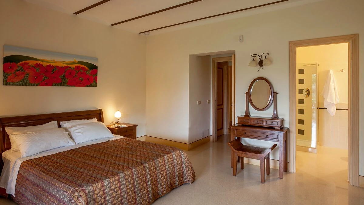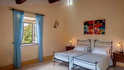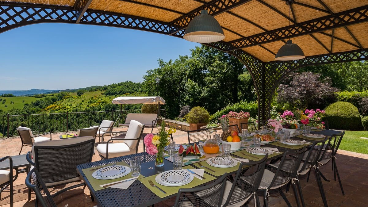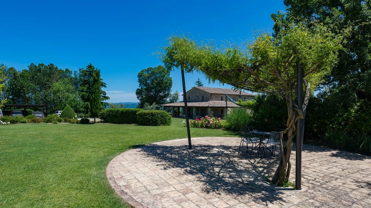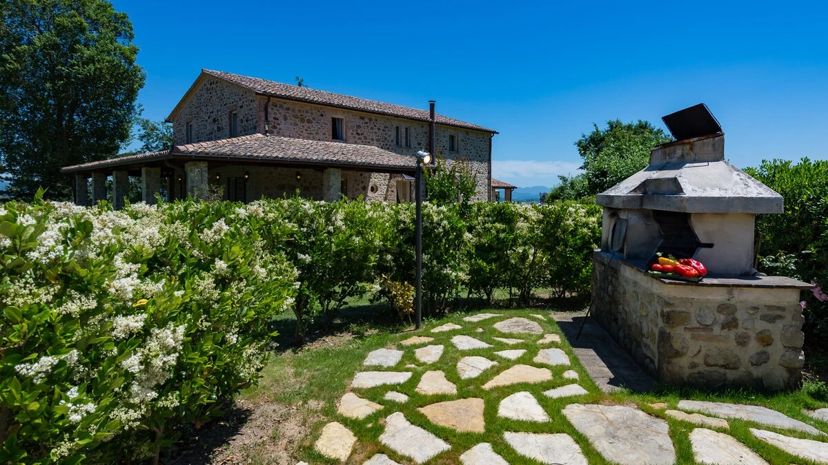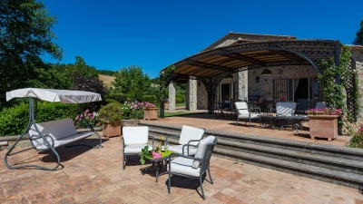 Set in the heart of Umbria’s countryside, Villa Zafferano has been beautifully transformed into a very spacious luxury villa for parties looking for a spacious and very private villa of very high standard. Encircled by beautiful mature gardens with breathtaking views, there are very extensive outdoor spaces at the villa including a vast lawned area with football goal behind the pool; a barbecue area, an al fresco dining area and ample tables and soft seating to relax and appreciate the far reaching views that stretch over the hills towards the city of Orvieto, clearly visible in the distance. The spacious interiors are carefully furnished in a contemporary style with light colours and beautifully appointed bathrooms. On the ground floor, there is ample kitchen, dining and living space and a TV room and room with pool table. There is direct access to the terrace, leading to the al fresco dining table and terraces with soft seating. Two double bedrooms with shower rooms en suite opening to the gardens complete the lower level of the villa. The first floor consists of four large bedrooms: a spacious double bedroom with shower room en suite, and a spacious twin bedroom with en suite bathroom and separate shower on one side of the villa and another spacious double with en suite shower and twin bedroom with en suite bath and shower located on the other side of the villa, making this an ideal choice for families travelling together. Cook service is available on request and Villa Zafferano is a short drive from Fabro and Allerona and 25 minutes from the lovely city of Orvieto.
