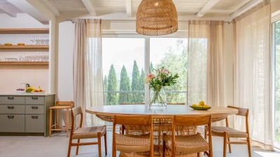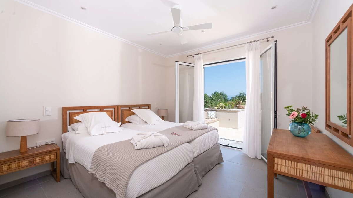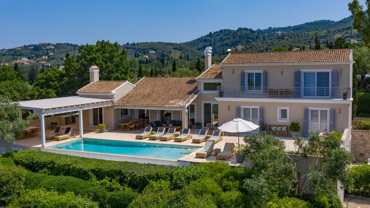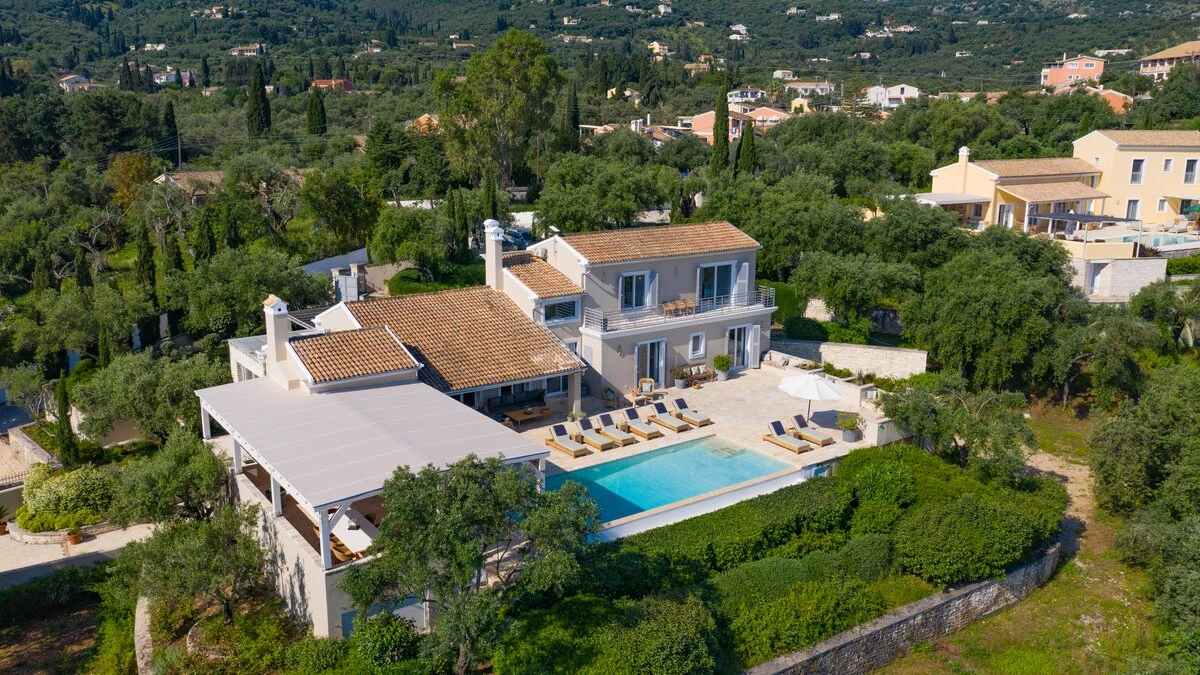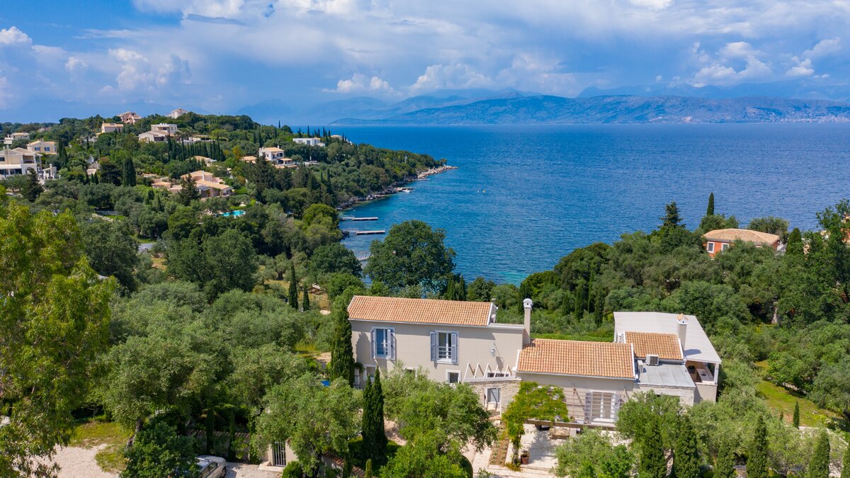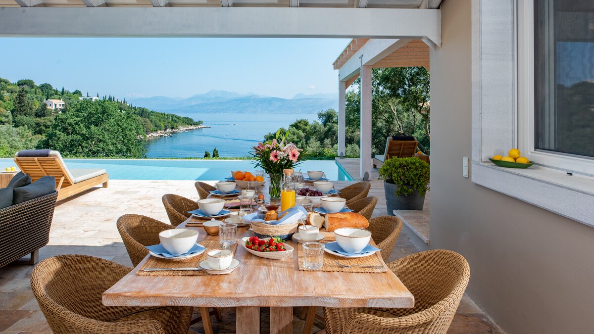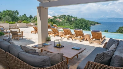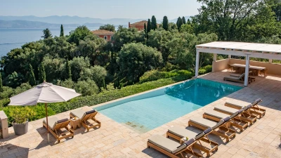 Artfully simple, elegantly sophisticated, and supremely relaxing, this is a lovely villa in the heart of Corfu’s uncrowded north-eastern corner. ‘Zografia’ means a painting, and the views from the sunny terraces and stylish rooms really are picture perfect, the sapphire blue of Soukia Bay flanked by sheltering headlands. A large infinity pool takes prime position out on the terrace, with a dining pergola at the poolside and a covered veranda forming an al fresco living room. From here a window wall leads into the house, where an airy sitting room is furnished in soft shades of blue, a romantic chandelier hangs from the raftered ceiling, and the adjoining dining area leads through to a smart galley kitchen. There are two bedrooms on this floor, a master double on the floor above, with a modern four-poster and private balcony, and a guest suite on the lower floor with its own sitting room. From Zografia’s quiet setting a rough path leads you to a beach with a boat mooring and tavernas at Avlaki just a ten minute walk away. Guests staying at Villa Zografia benefit from concierge service and breakfast service.