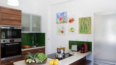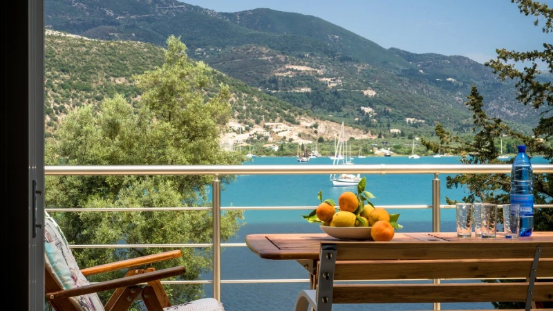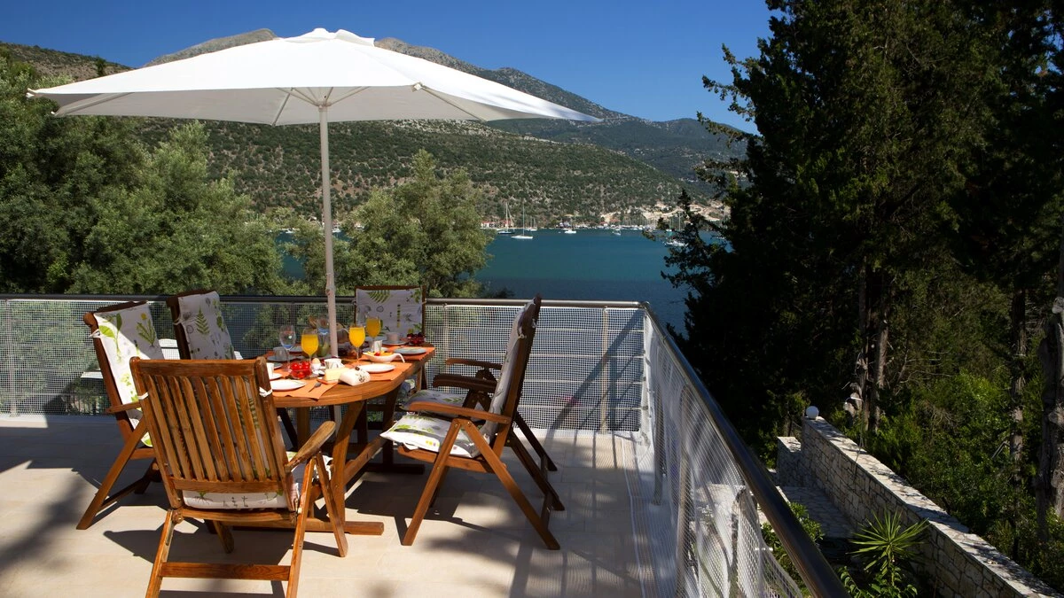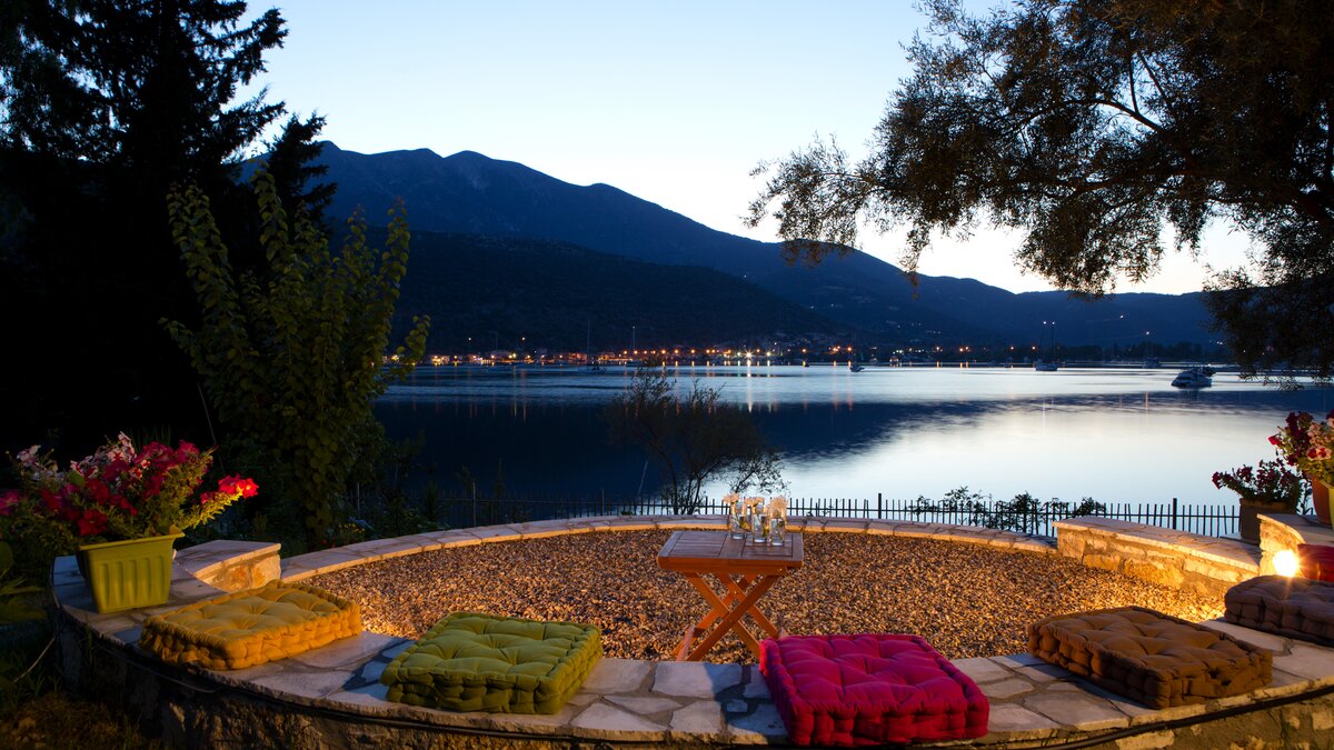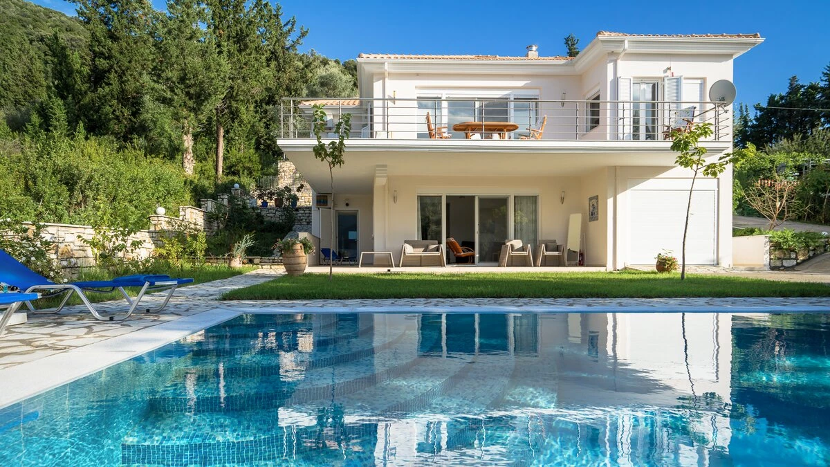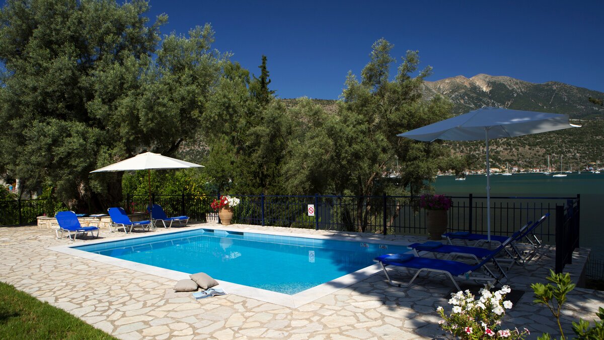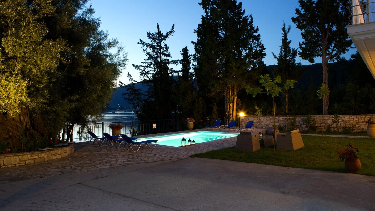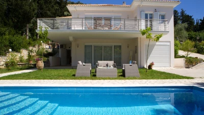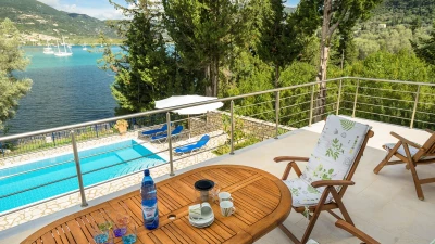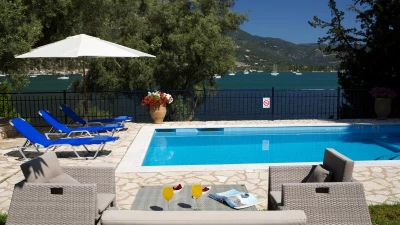 This villa is set in lawned gardens with a private mooring and a strip of shingle beach. The upper terrace with dining table offers its own perspective on the bay below, another paved area at the side and rear is perfect for a shaded dining table, another perfect for enjoying a drink at sundown and the pool terrace is replete with loungers. Within the welcoming villa, attractively furnished rooms are finished with a personal touch and include three bedrooms, each with air conditioning, 3 shower rooms, and doors to the terrace. Fitted in contemporary style, the kitchen and dining room has doors to the upper terrace, while the downstairs airy sitting room is flooded with light. Between 300 - 500m from local tavernas, and not far from a mini-market and with a bakery at 2km, the villa is within 5km of Desimi beach and 6km from Nidri, though both could be accessed more pleasurably by boat from the jetty. This is a conservation area and you may spot a Kingfisher, honeyeater or great white heron in the bay or surrounding trees.
