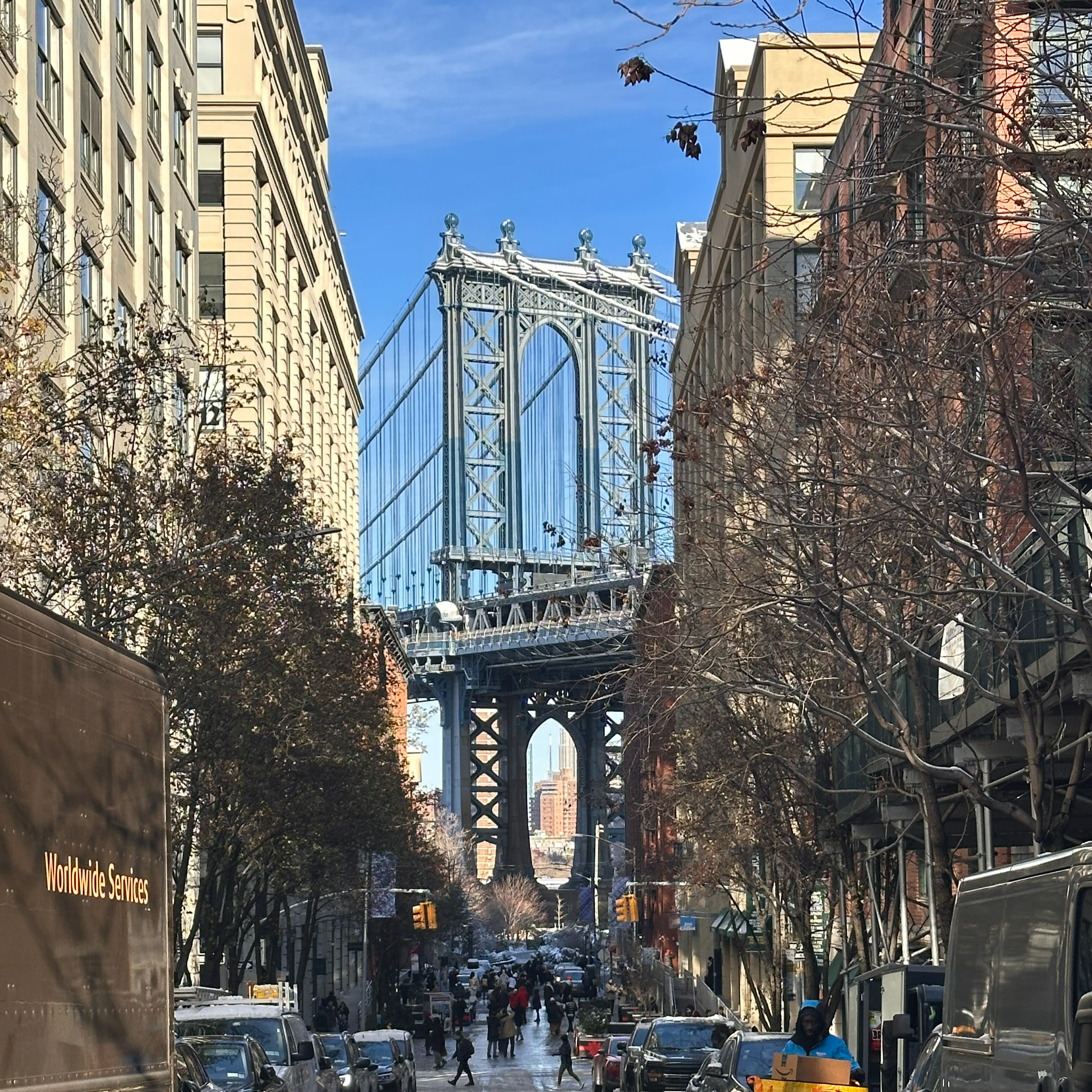 Washington Street in DUMBO, the Manhattan Bridge perfectly framed between red‑brick buildings, the Empire State Building peeking through.