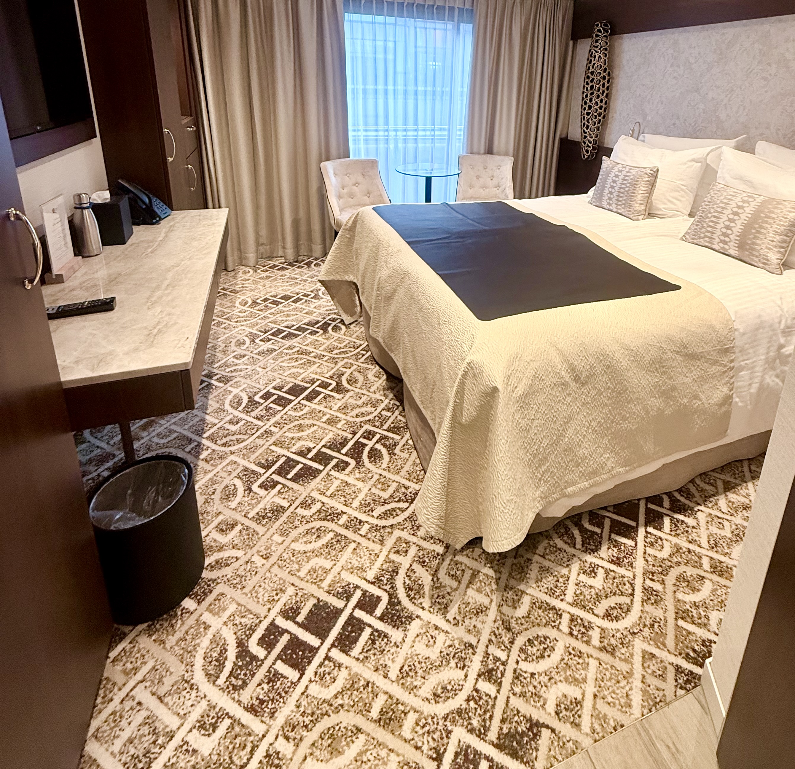 There’s a proper seating area in the room too, with two chairs and a table where you can sit and watch the world go... Most rooms feature a French balcony where you can open the floor-to-ceiling windows. Bathrooms are a good size too, with a strong power shower, and there’s enough room to get ready without feeling cramped. You also have bathrobes, slippers, and an umbrella. full-length mirrors and plenty of storage space in the cabin