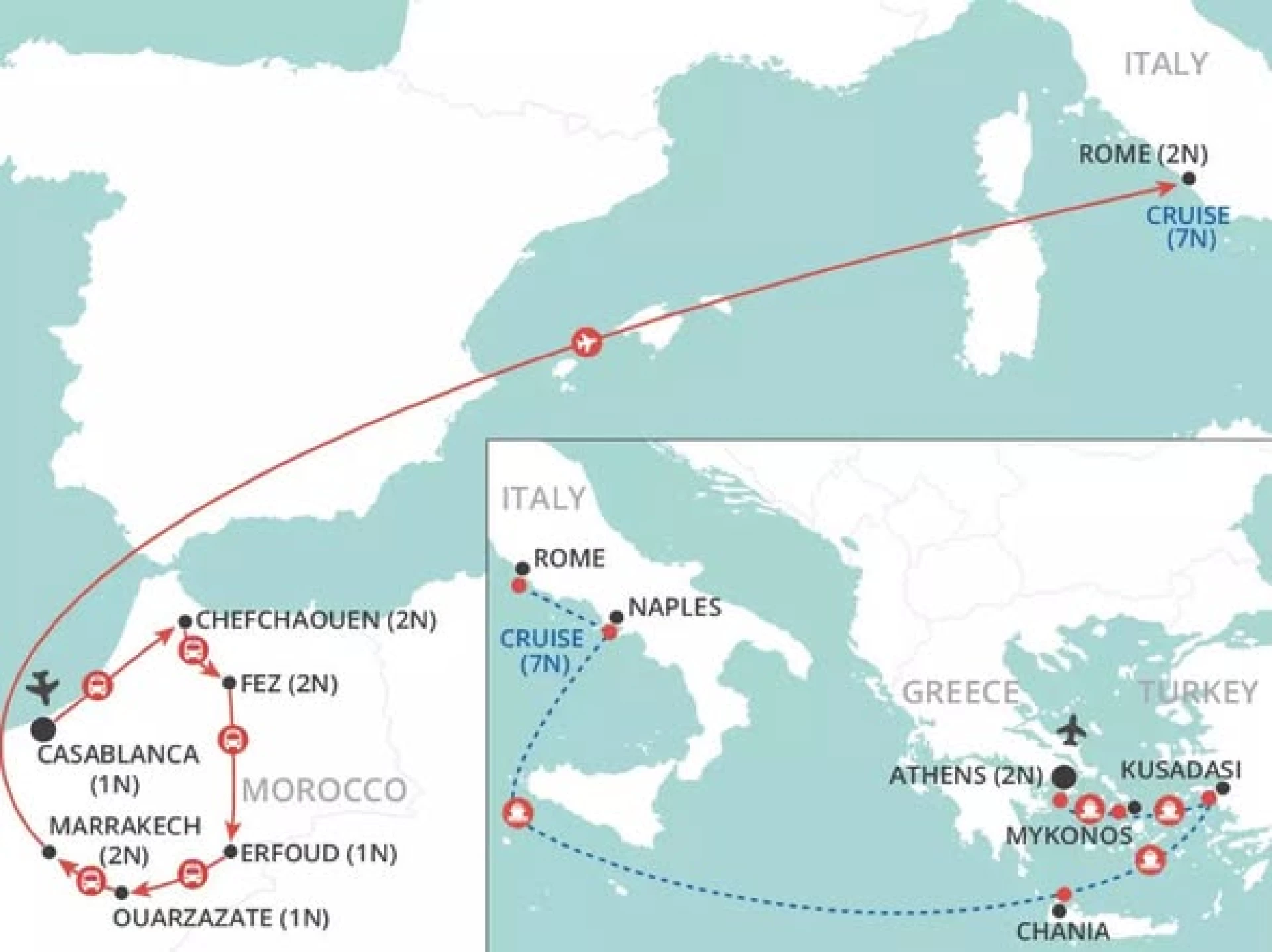 Embark on an unforgettable journey that blends the magic of Morocco with the beauty of the Mediterranean. Wander through the blue streets of Chefchaouen, explore Marrakech’s vibrant medina, and then set sail on a luxurious Princess Cruise between Rome and Athens. This is the ultimate combination of land adventures, cultural encounters, and the pleasures of cruising.