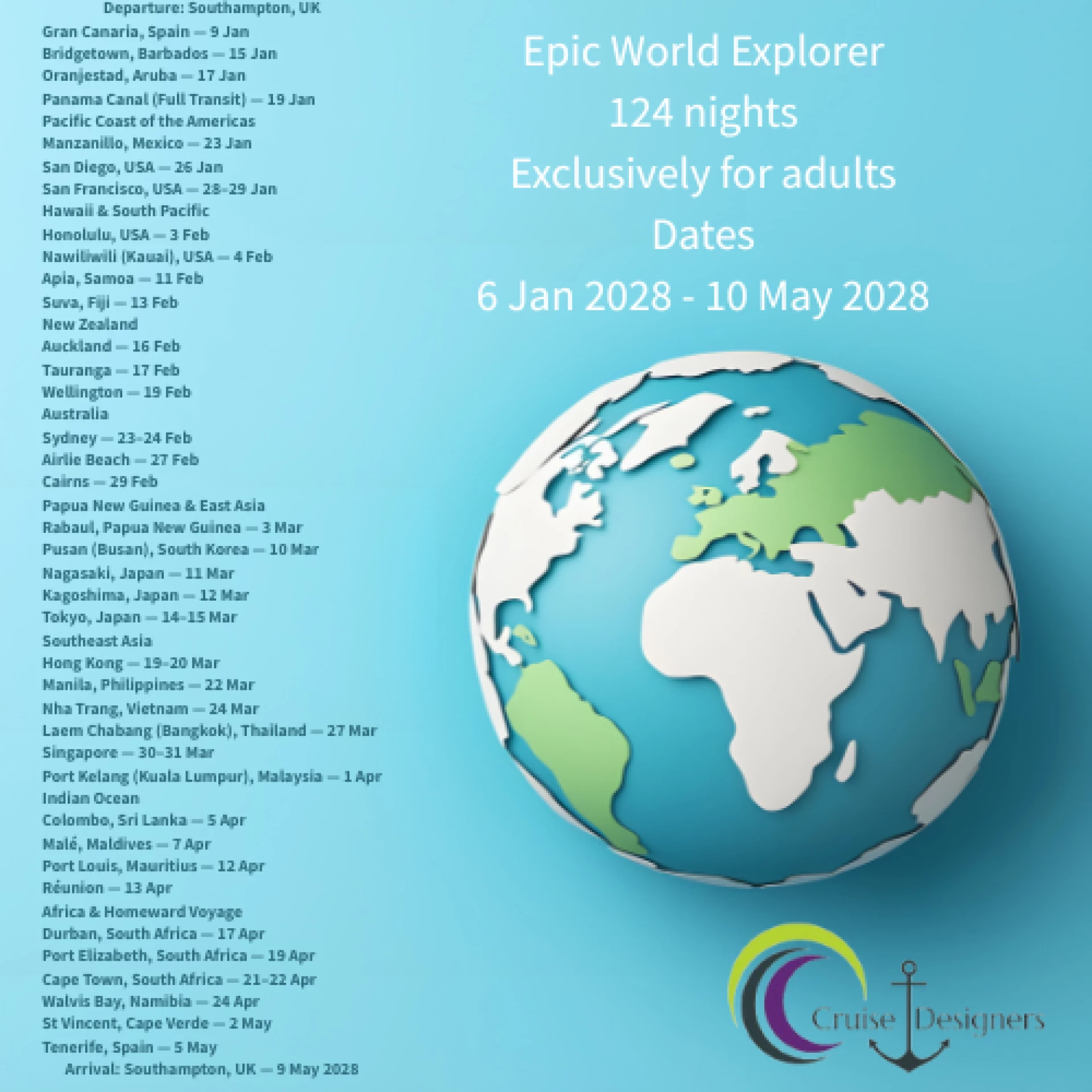 Set sail aboard P&O Cruises’ Arcadia on 6 January 2028 for an epic 124-night World Cruise from Southampton, UK. From the sunny Canaries and Caribbean to the vibrant cities of Asia, the natural wonders of New Zealand and Australia, and the exotic beauty of the Indian Ocean, this voyage connects the world’s most iconic destinations in one unforgettable adventure.